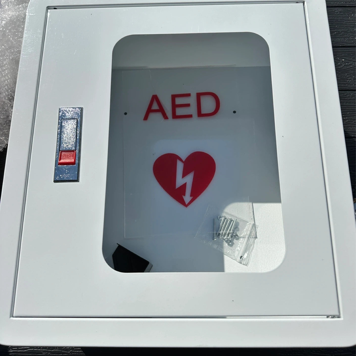 Plastic has been cracked as shown in the picture Selling a wall mounted AED cabinet. It's designed to store an automated external defibrillator (AED). The cabinet is white with a clear window and features the AED logo with a heart and lightning bolt. It's wall mountable with pre-drilled holes for easy mounting. Dimensions are approximately 15.7in x 14in x 7.8in
