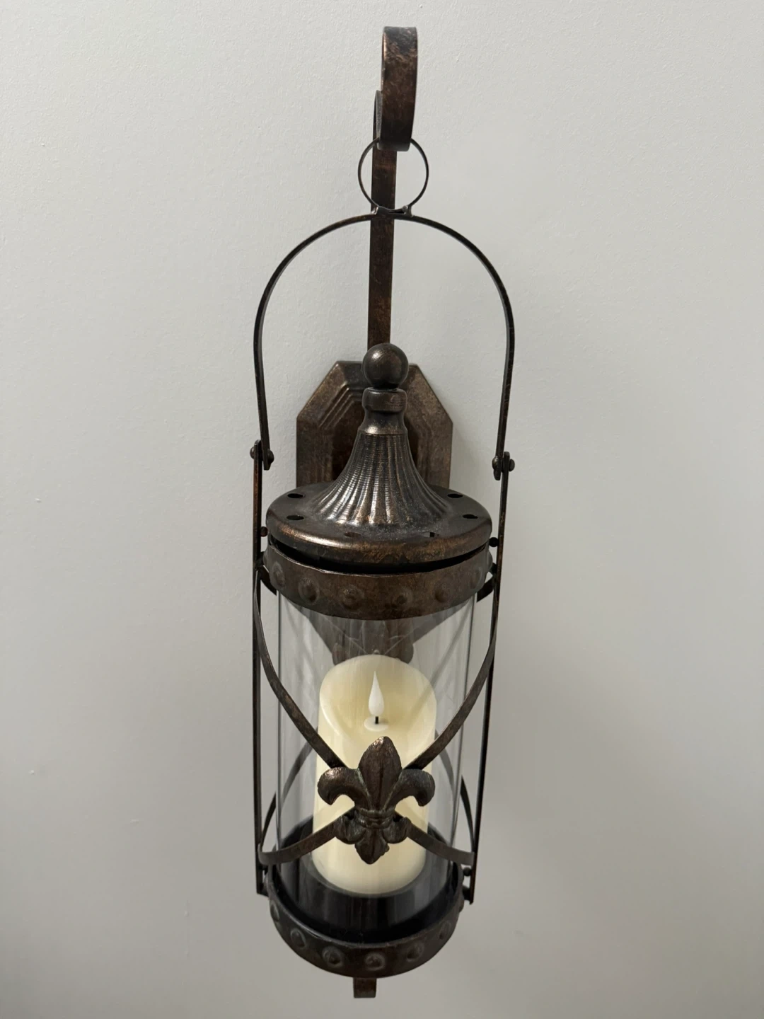 This is a lovely wall sconce candle holder that would add a touch of elegance to any room! It features a decorative fleur-de-lis design and a rustic, antique-bronze finish