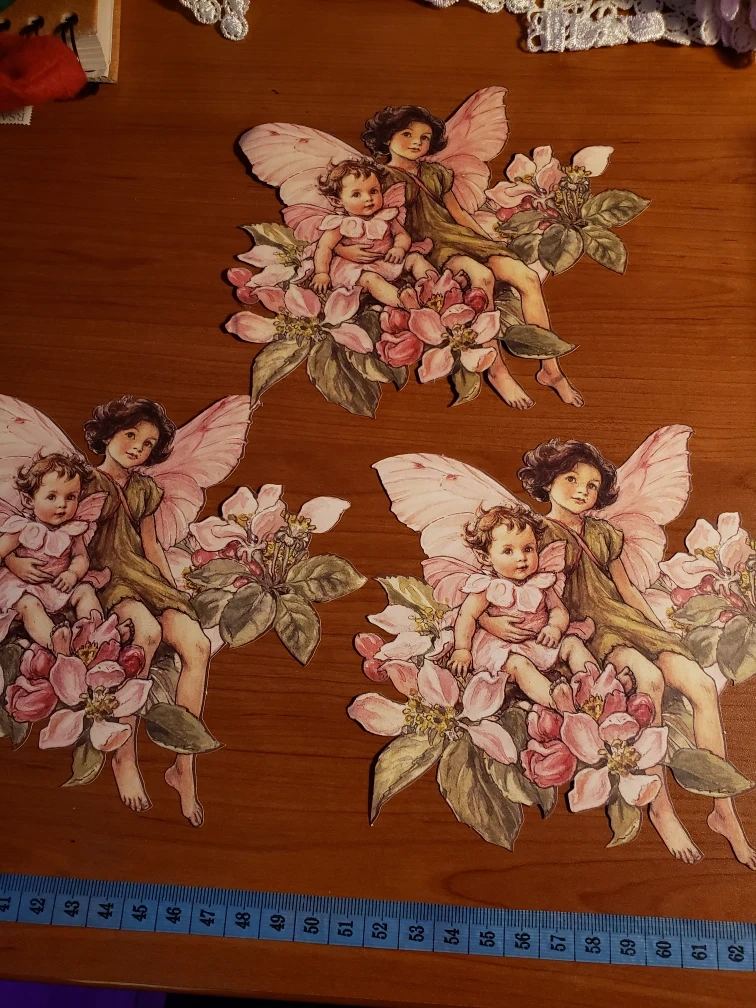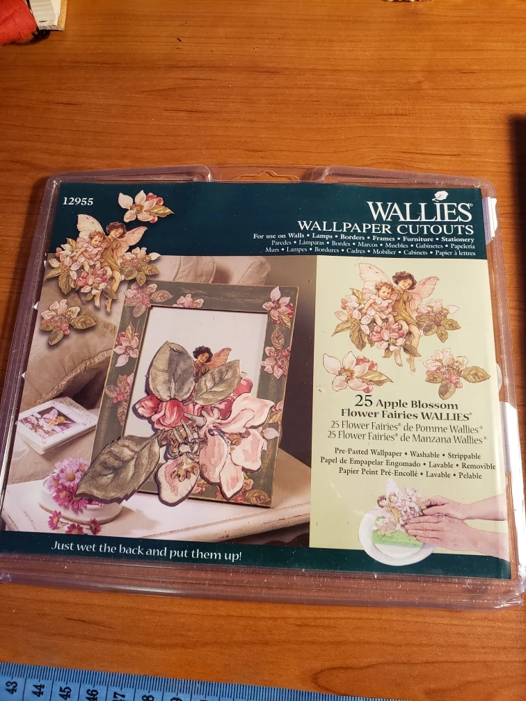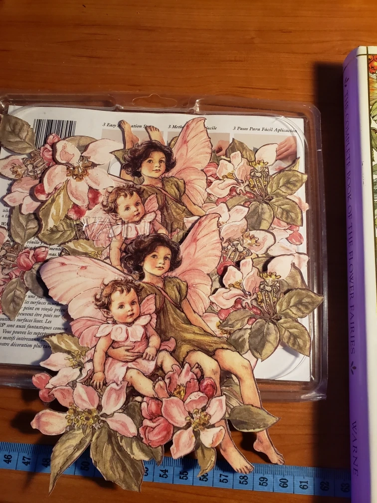 3 flower fairies, pre-pasted, removable, washable, and reusable. 3 Easy application steps. Just wet the back and put them up! Have not been used, only one has podge on the outside.