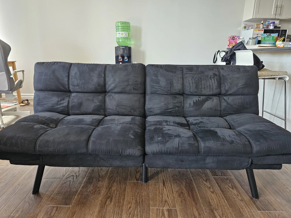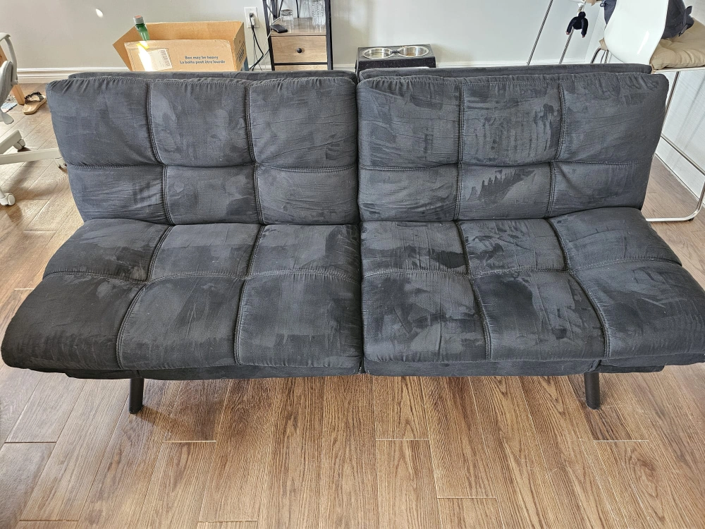 Walmart Black Futon Sofa Bed (Convertible Couch / Guest Bed) Condition: Excellent โ gently used, no stains or damage. The marks in the photo are just from light cleaning and will disappear as it dries. ๐ Features Converts easily from sofa to bed (perfect for guests or small apartments) Soft microfiber upholstery in elegant black Modern tufted design with split backrest โ recline each side independently Compact and sturdy metal legs; fits well in living room or office Comfortable to sit or sleep on; easy to clean and maintain โจ Stylish, space-saving, and ready to use!