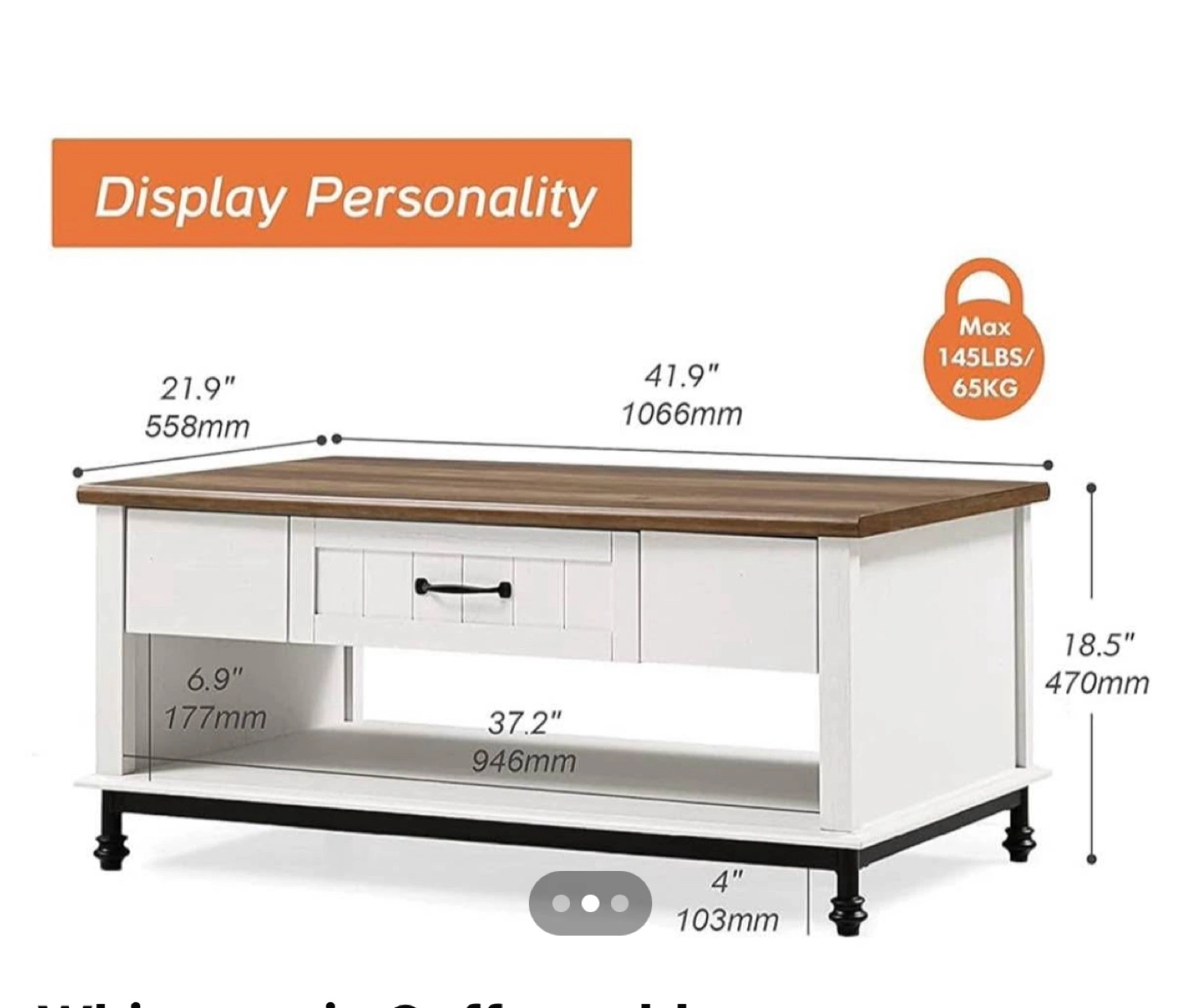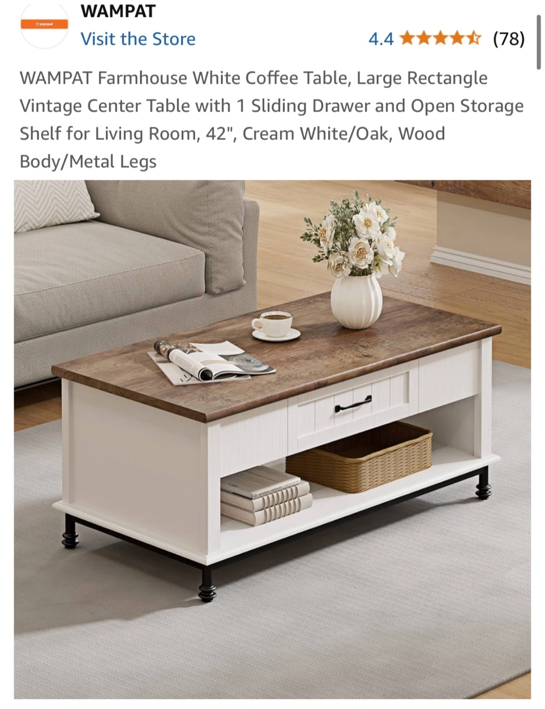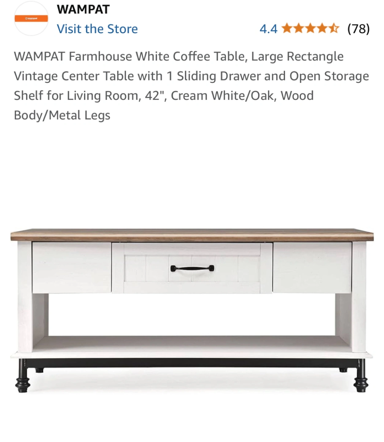 Selling a WAMPAT farmhouse-style coffee table! It features a large rectangle vintage center table with one sliding drawer and an open storage shelf, perfect for the living room. The table is 42 inches, with a cream white/oak finish and a wood body with metal legs.