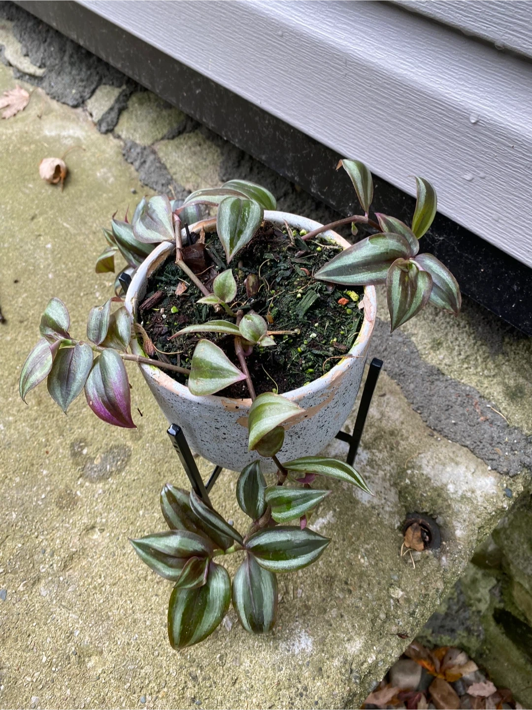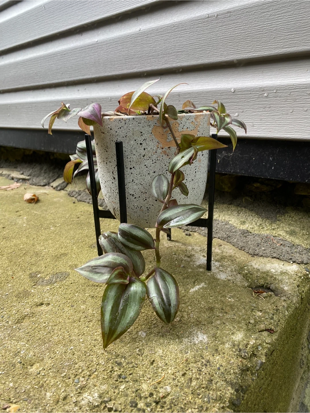 Selling a lovely Wandering Jew plant in a decorative pot with a stand. It's a vibrant and easy-to-care-for plant that will add a touch of green to any space! It's in great condition and ready to brighten up your home