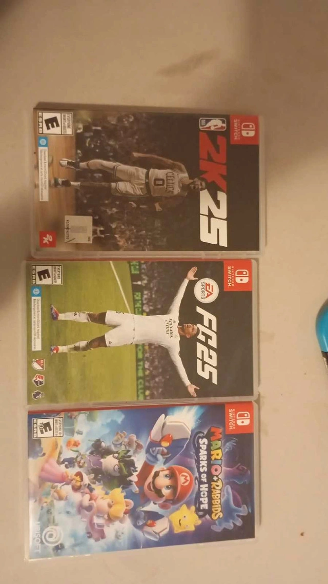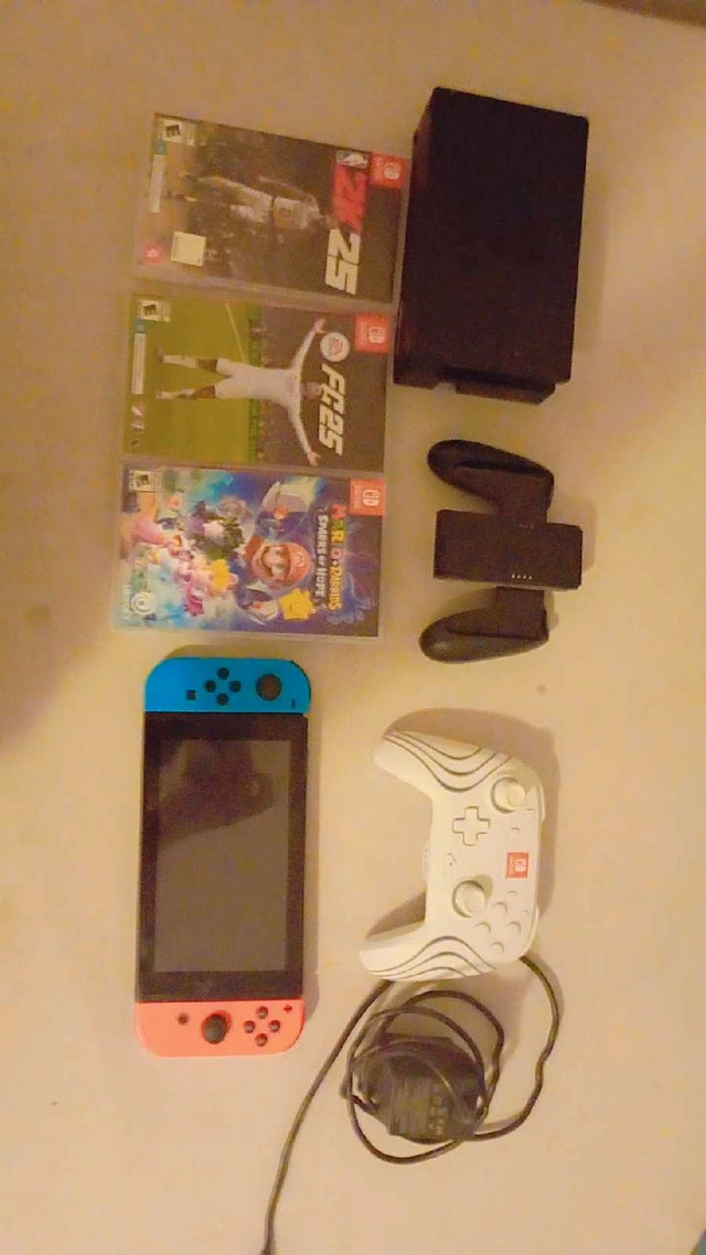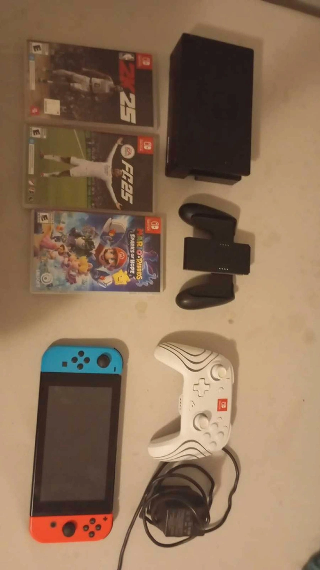 Nintendo Switch Items for Saletrocko Everything pictured is available – prices below: Nintendo Switch OLED + Charger + Black Dock + Black Joypad - $ 200 White Controller- $50 Each Game – $50 NBA 2K25 EA Sports FC 25 Mario + Rabbids: Sparks of Hope Everything is for $400 All items in great condition. Bundle deals available – message if you're interested!