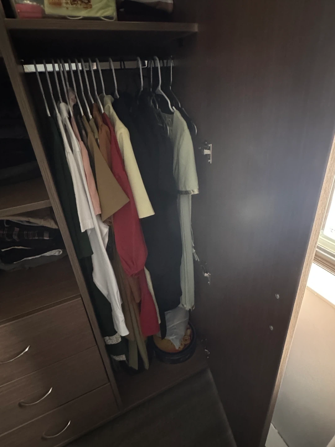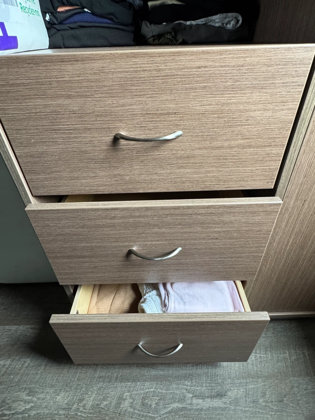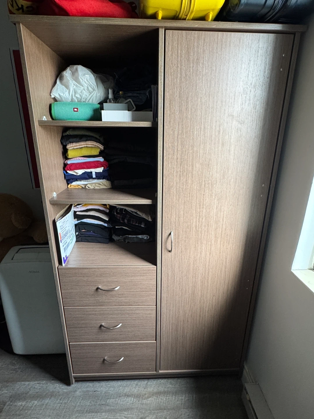 Selling a wardrobe with drawers. It's in great condition and has plenty of storage space for your clothes and other items. Has a section for hanging clothes and three drawers at the bottom for extra storage In inches H=70 W=40 D=23