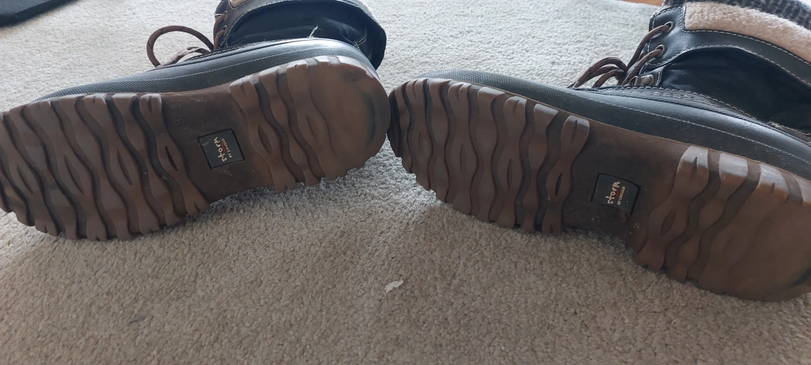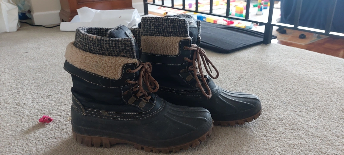 Black rubber-soled boots. Features brown laces. Lined with a fluffy material around the opening. Perfect for enjoying a scenic winter walk.
