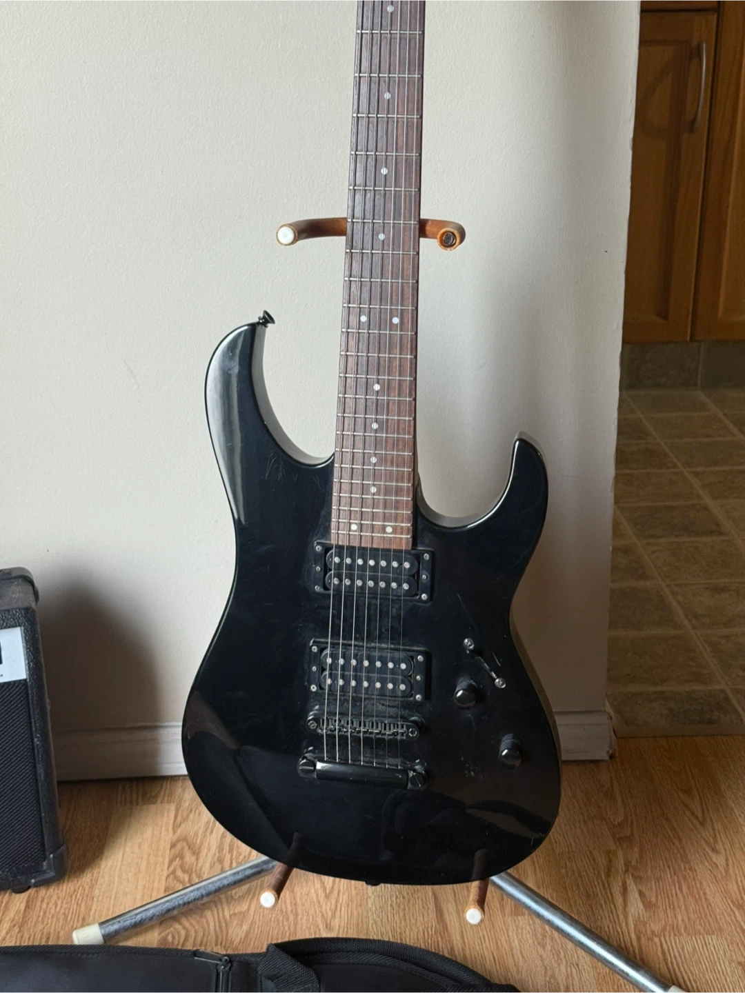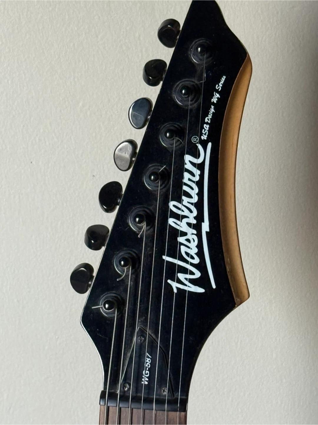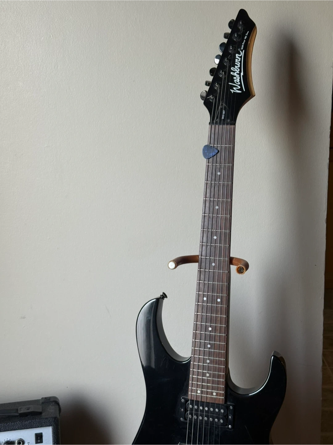 Shred like a pro with this Washburn 7-string guitar WG-587, designed for heavy riffs and soaring solos! This used axe is ready to rock, featuring a sleek black finish and wicked tone. While it shows signs of use, it's packed with potential for any metalhead or progressive player. Unleash your inner guitar hero today! From serial number This guitar is from 2000 A Y2K guitar and a nice start to a collection or ad to it * Brand: Washburn * Number of Strings: 7 * Colour: Black * Body Type: Solid Body Comes with -WG587 Guitar -GWL 10G Amp -Soft Padded Gig Bag -Guitar Stand -black pick -cord Asking $600.00 Just a friendly heads-up: if you're seeing this ad, the guitar is still up for grabs. Let's make some music happen! Guitar Specs. WG587 - Washburn WG587 - Audiofanzine The Washburn WG-587 is a 7-string electric guitar with an Alder or Basswood body, a bolt-on Maple neck with a Rosewood fretboard, and 24 frets. It features black Grover tuners and a Tune-O-Matic bridge, two Washburn 7-string humbucker pickups, a single volume and tone control, and a 3-way pickup selector switch. The guitar was produced between 1999 and 2002, with a similar "superstrat" style to the Ibanez RG series. Key Specifications Model: WG-587 Type: 7-string electric guitar Body: Alder or Basswood Neck: Bolt-on, Maple Fretboard: Rosewood Frets: 24 Tuners: Black Grover Bridge: Tune-O-Matic Pickups: 2 x Washburn humbuckers Controls: 1 x Volume, 1 x Tone, 3-Way Switch Era of Production: 1999-2002 Variations WG-587-V: This version was available with a Floyd Rose vibrato and an HSH pickup configuration. Finish: Available in Metallic Red or Metallic Grey/Sparkle finishes.