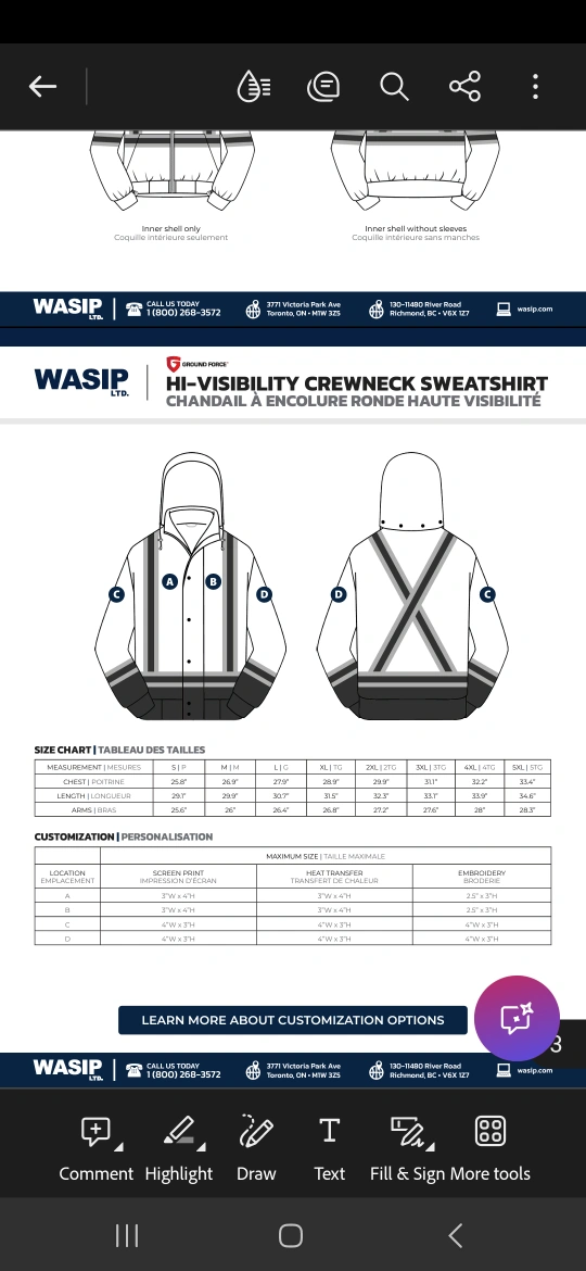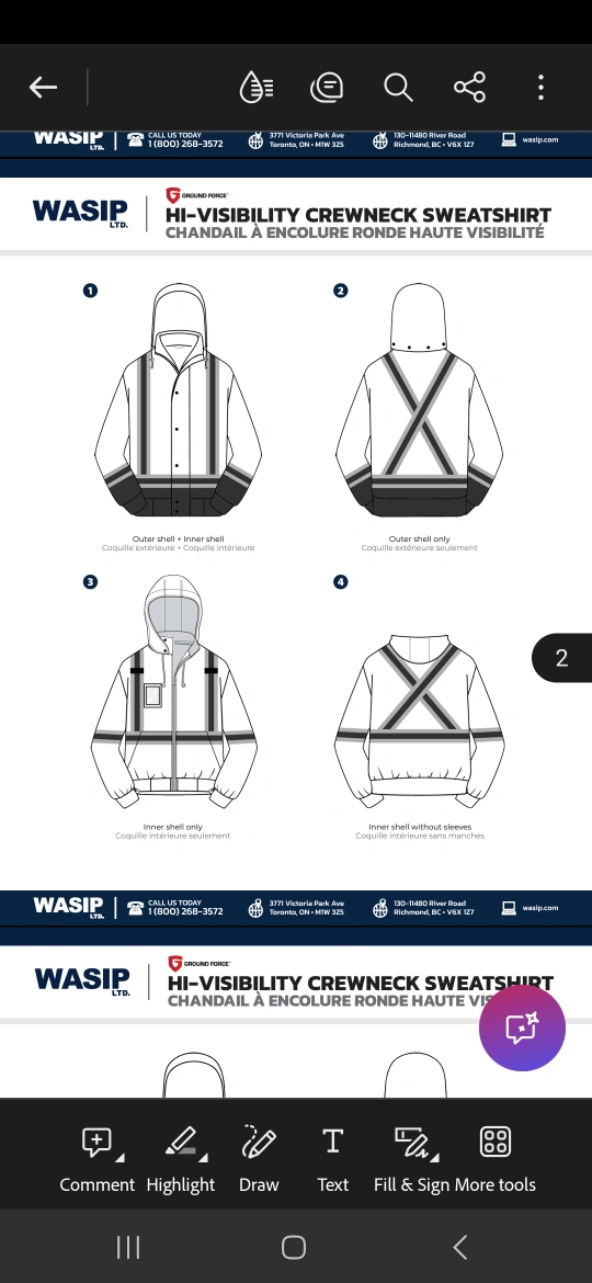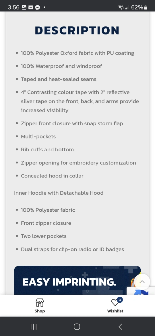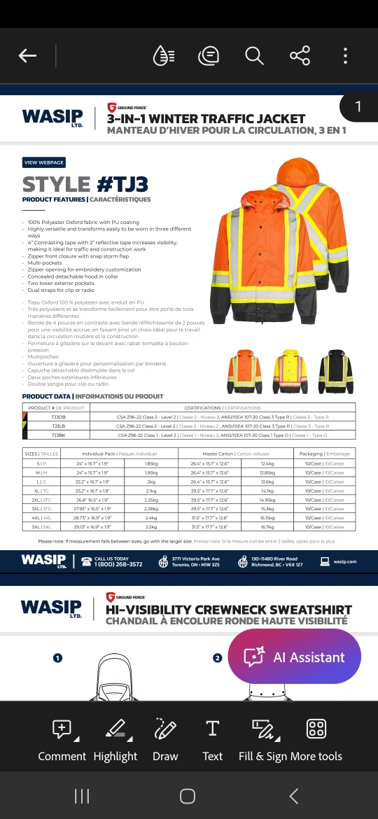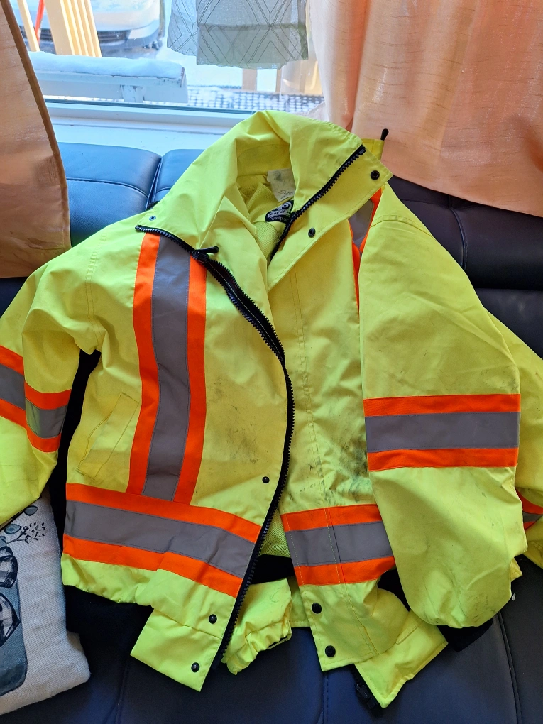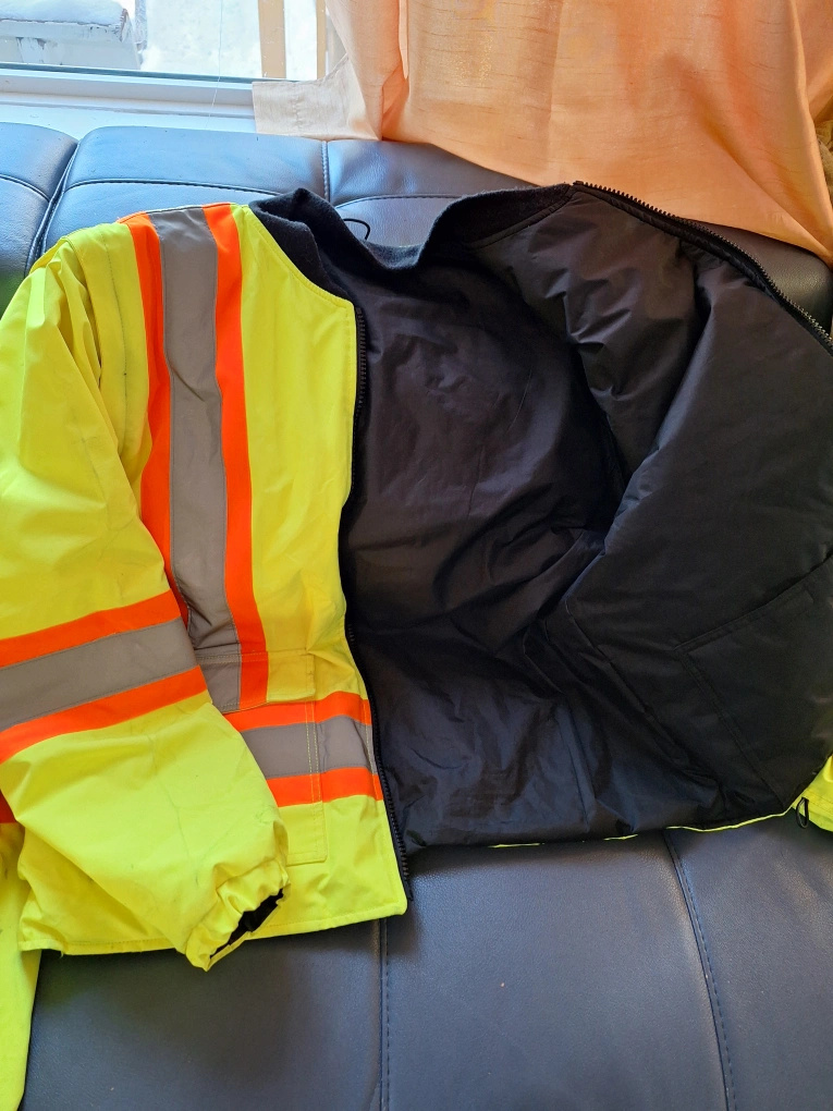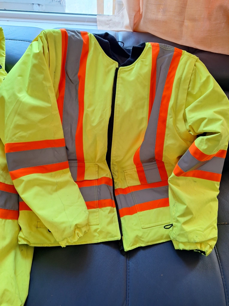 Yellow high-visibility jacket. Features orange and silver reflective tape. Removable liner. Multiple pockets. Good for work or outdoor activities.