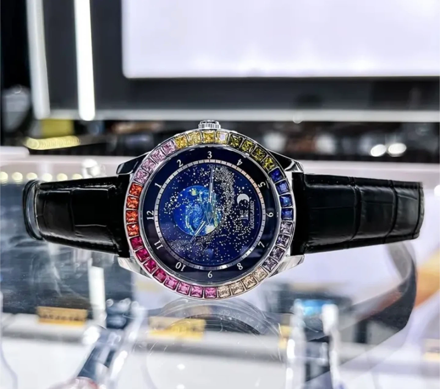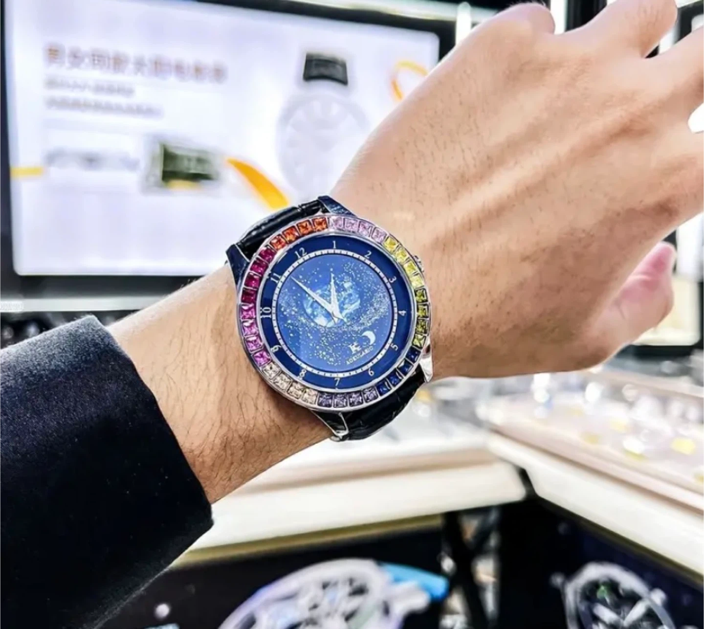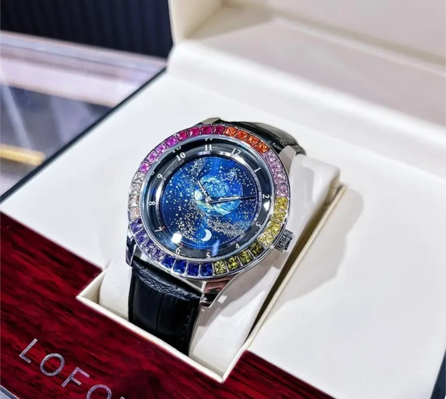 Galaxy on the dial MOVES!! Glow in the dark. Dm me for video it doesn’t let me upload video on here for some reason. Selling a beautiful watch with a unique design. It features a stunning blue dial with a celestial pattern and a rainbow of gemstones around the bezel. The watch has a black leather strap and comes in its original box. It's in great condition and ready to add a touch of sparkle to your wrist