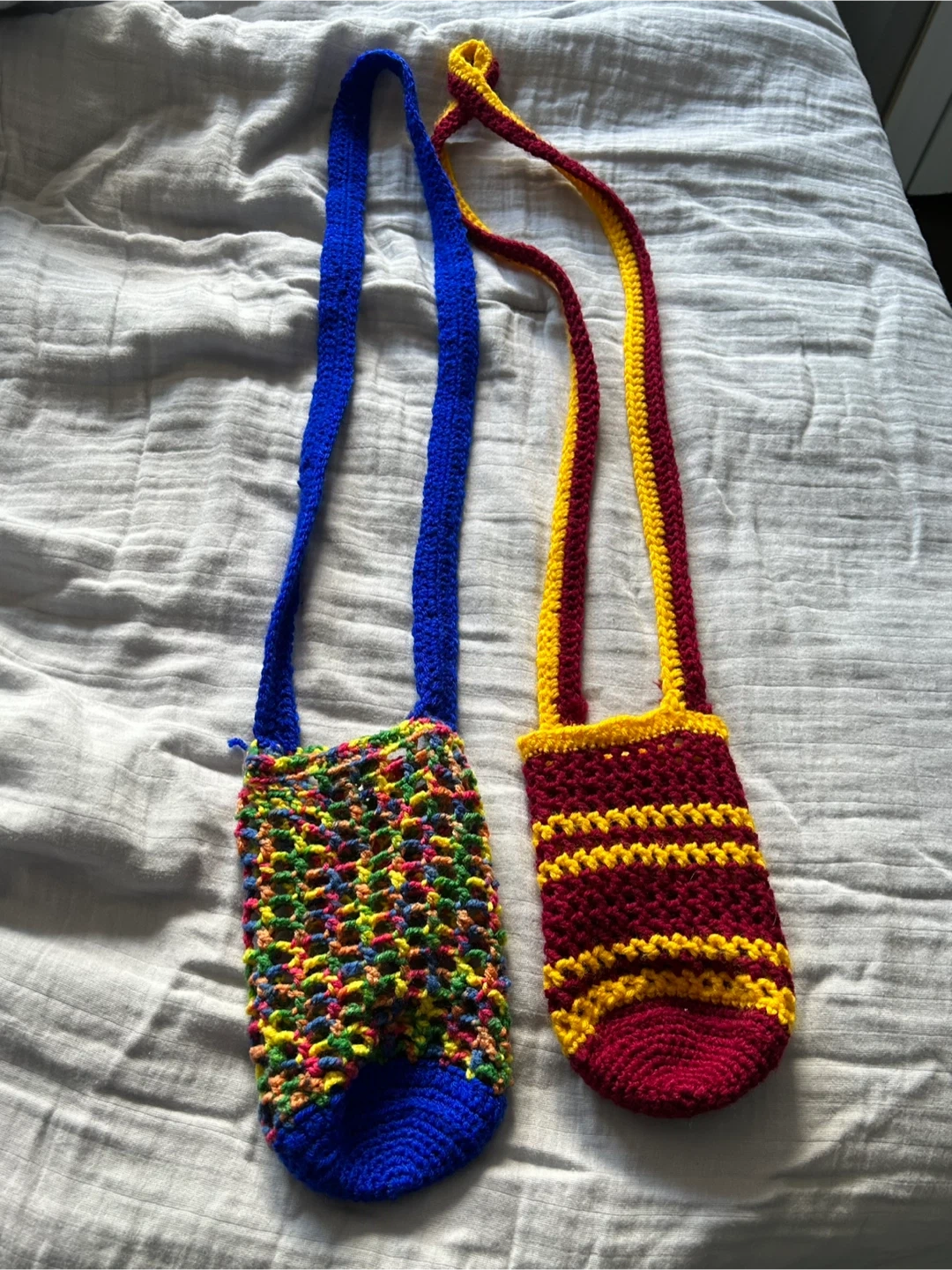Selling handmade crocheted water bottle bags! One is a vibrant mix of colours with a blue base and strap, and the other is a cozy maroon and yellow striped Harry Potter inspired design. Perfect for carrying your water bottle in style! Buy one or two!