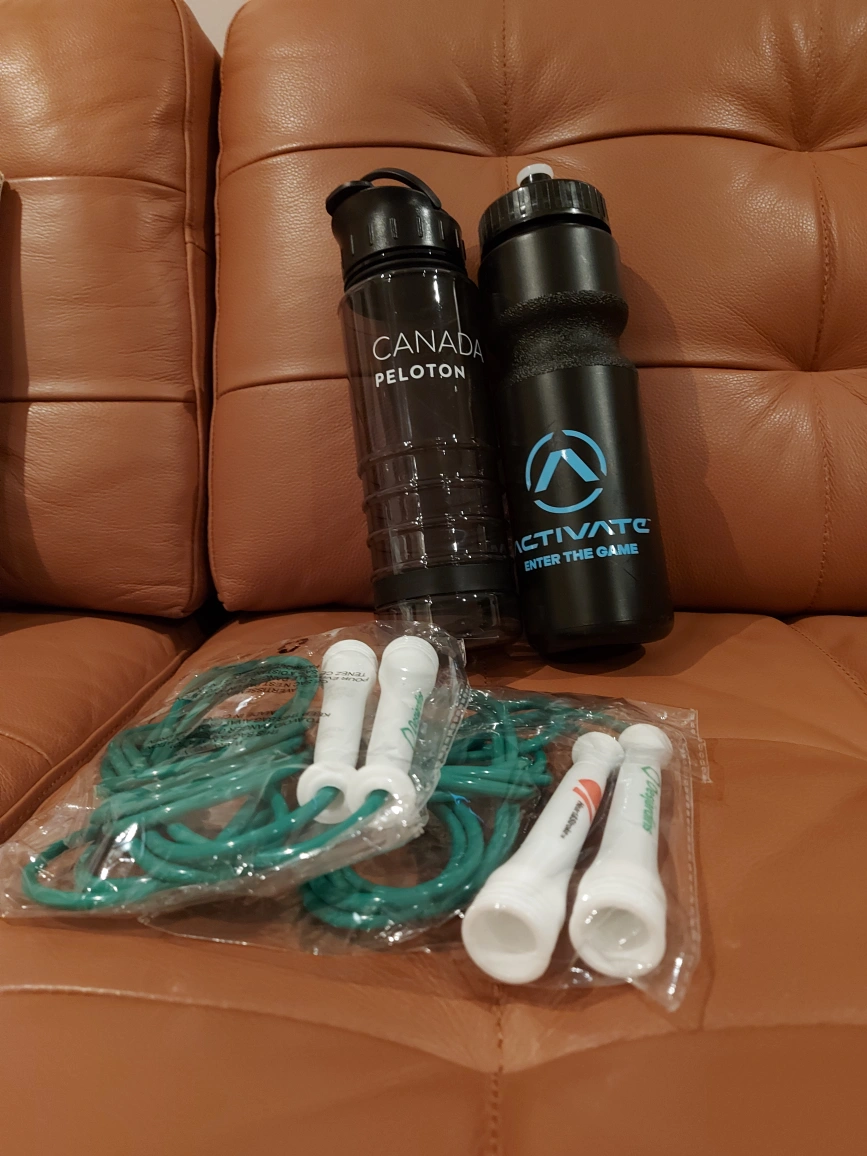 The water bottle is a Canada Peloton branded bottle. The jump rope is still in its original packaging. Take one or all for free.