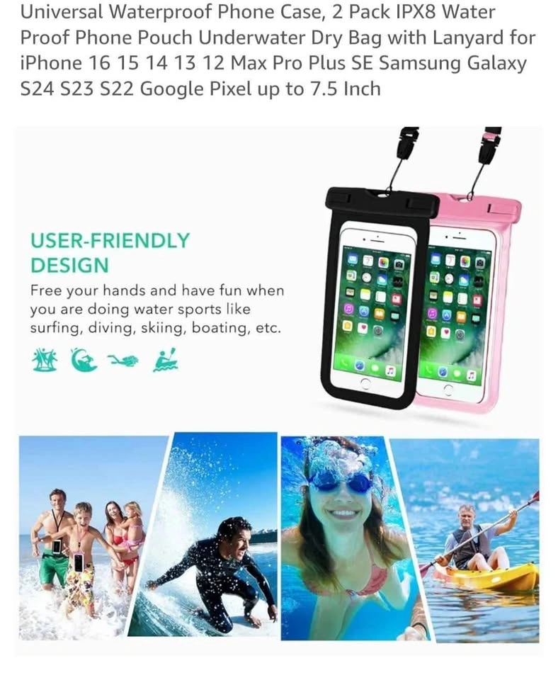 Universal Waterproof Phone Case, 2 Pack IPX8 Water Proof Phone Pouch Underwater Dry Bag with Lanyard for iPhone [hidden information] Max Pro Plus SE Samsung Galaxy S24 S23 S22 Google Pixel up to 7.5 Inch. $5 per pieces. 2 pcs together in one packet so $10 cash. Pick up Markham and Ellesmere. Check my other listings too. Thanks ☺