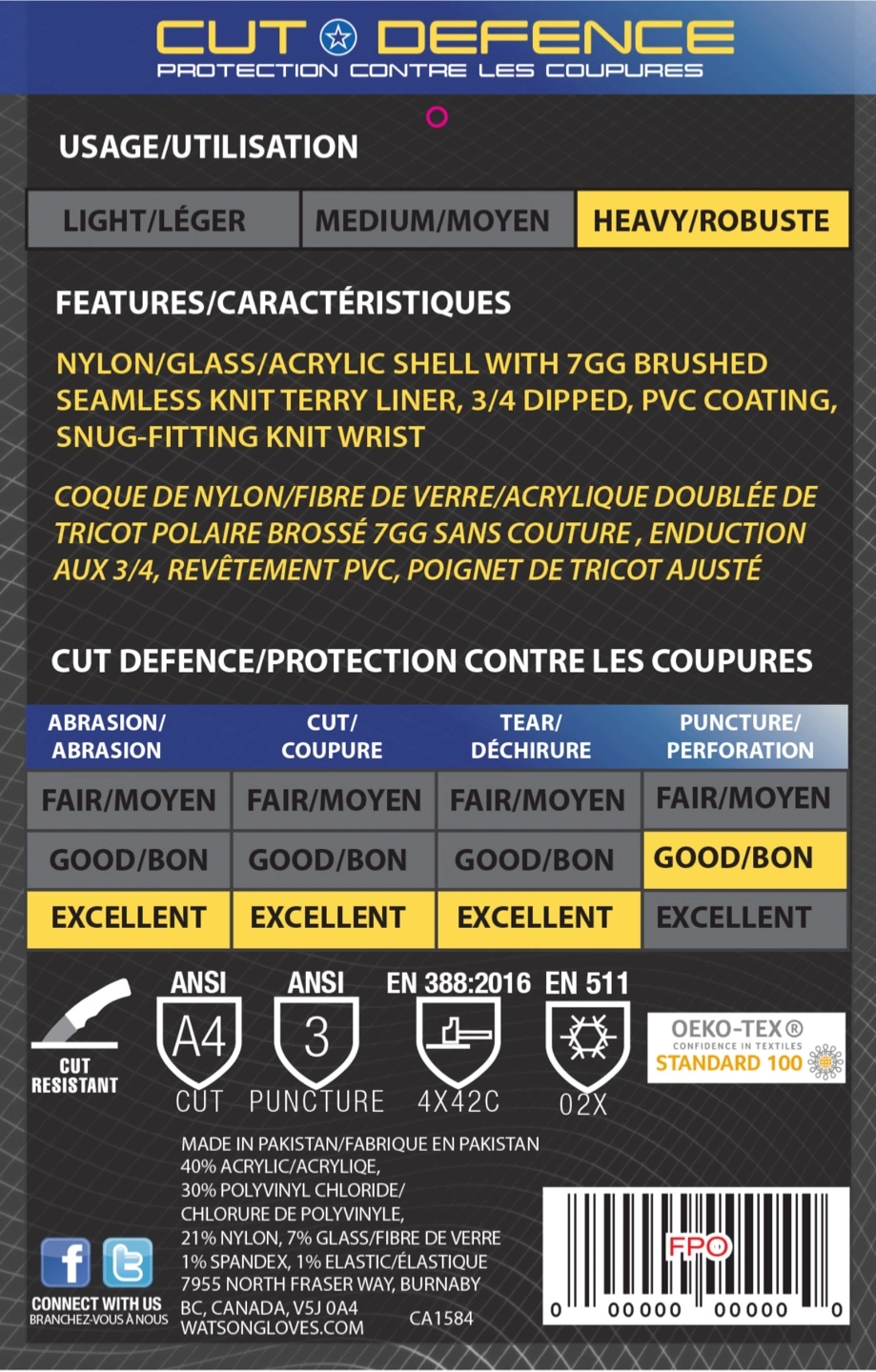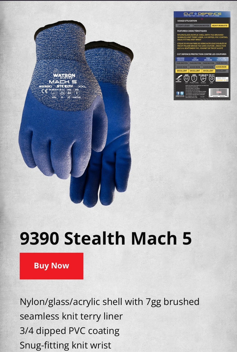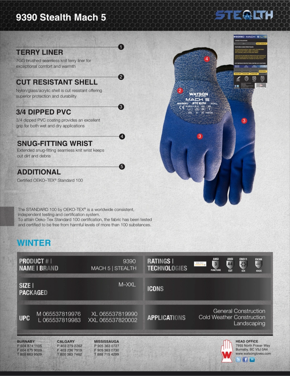 Selling a pair of Watson Stealth Mach 5 gloves, size XL-XXL. These gloves feature a nylon/glass/acrylic shell with a 7gg brushed seamless knit terry liner and a 3/4 dipped PVC coating. They also have a snug-fitting knit wrist for added comfort and protection. Perfect for general construction, cold weather construction, and landscaping