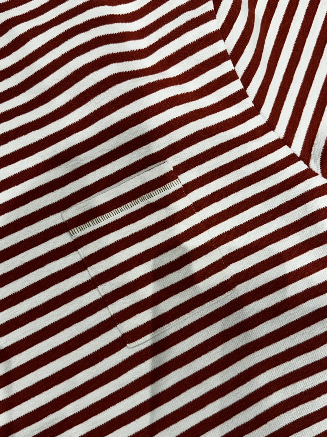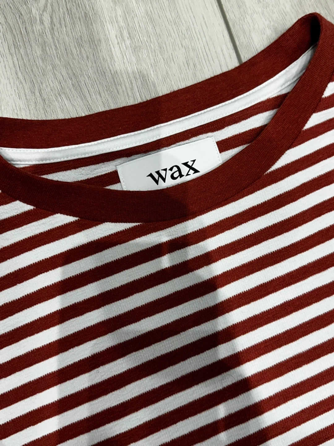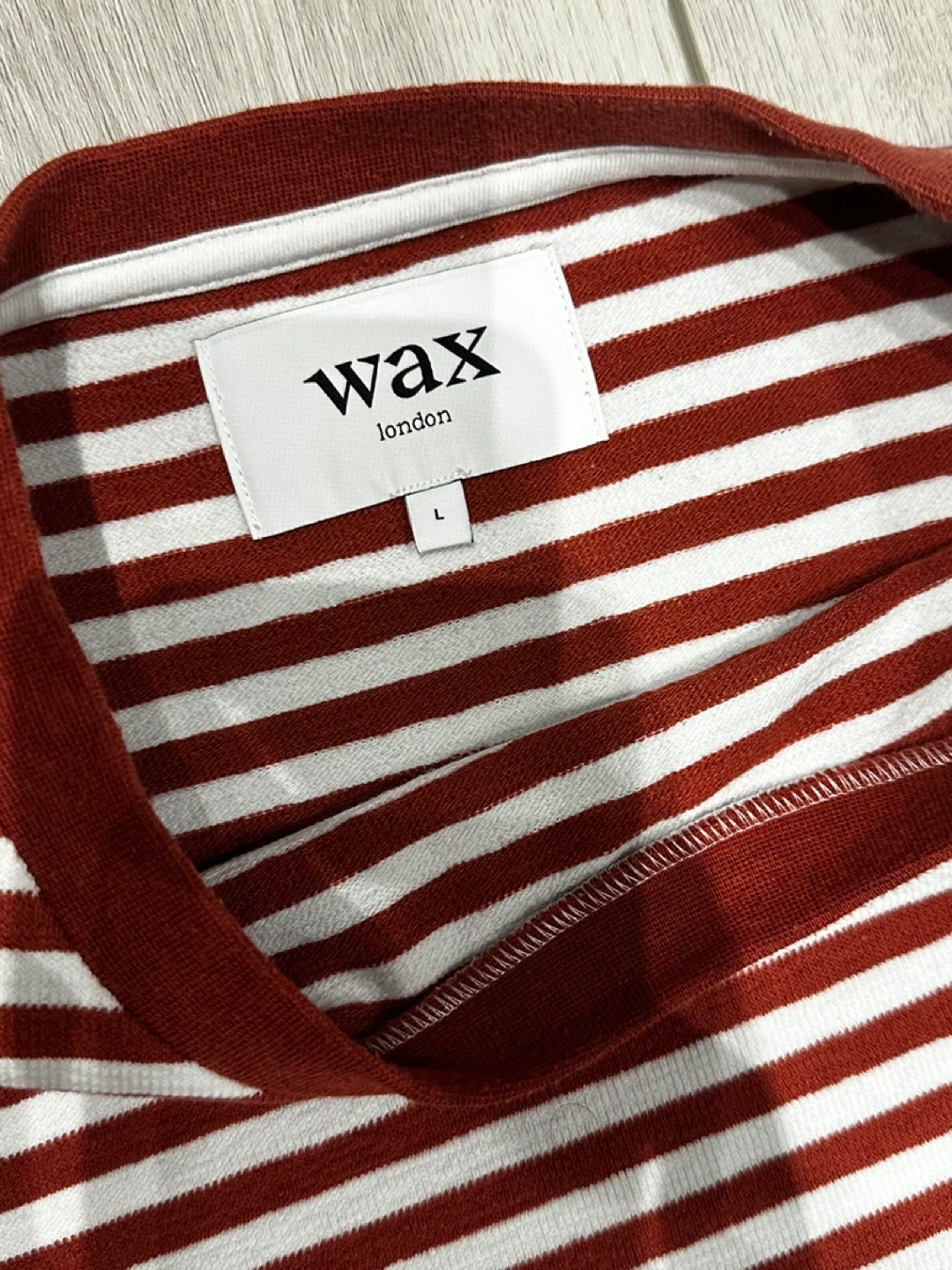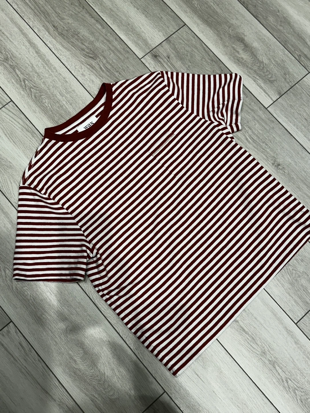 Selling a Wax London striped t-shirt in size L. It features a cool striped pattern and a small pocket detail. Great for casual wear! Colour is burgundy and ecru/white. Washed but never worn.