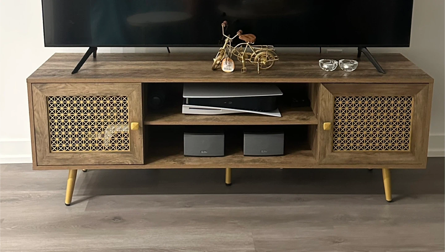 Selling a rustic brown and gold TV stand that adds a touch of warmth to any living space! Does not fit my new TV size It fits up to 70inch TV Pick up only! Vaughan location