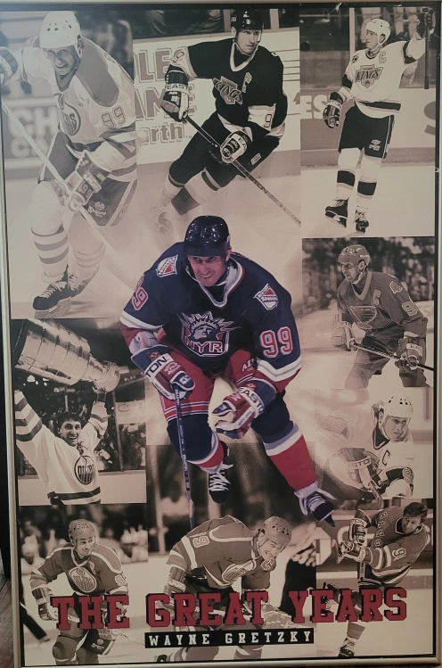 A framed poster featuring multiple photos of Wayne Gretzky from different points in his career. The poster is titled "The Great Years" and features his name prominently at the bottom.