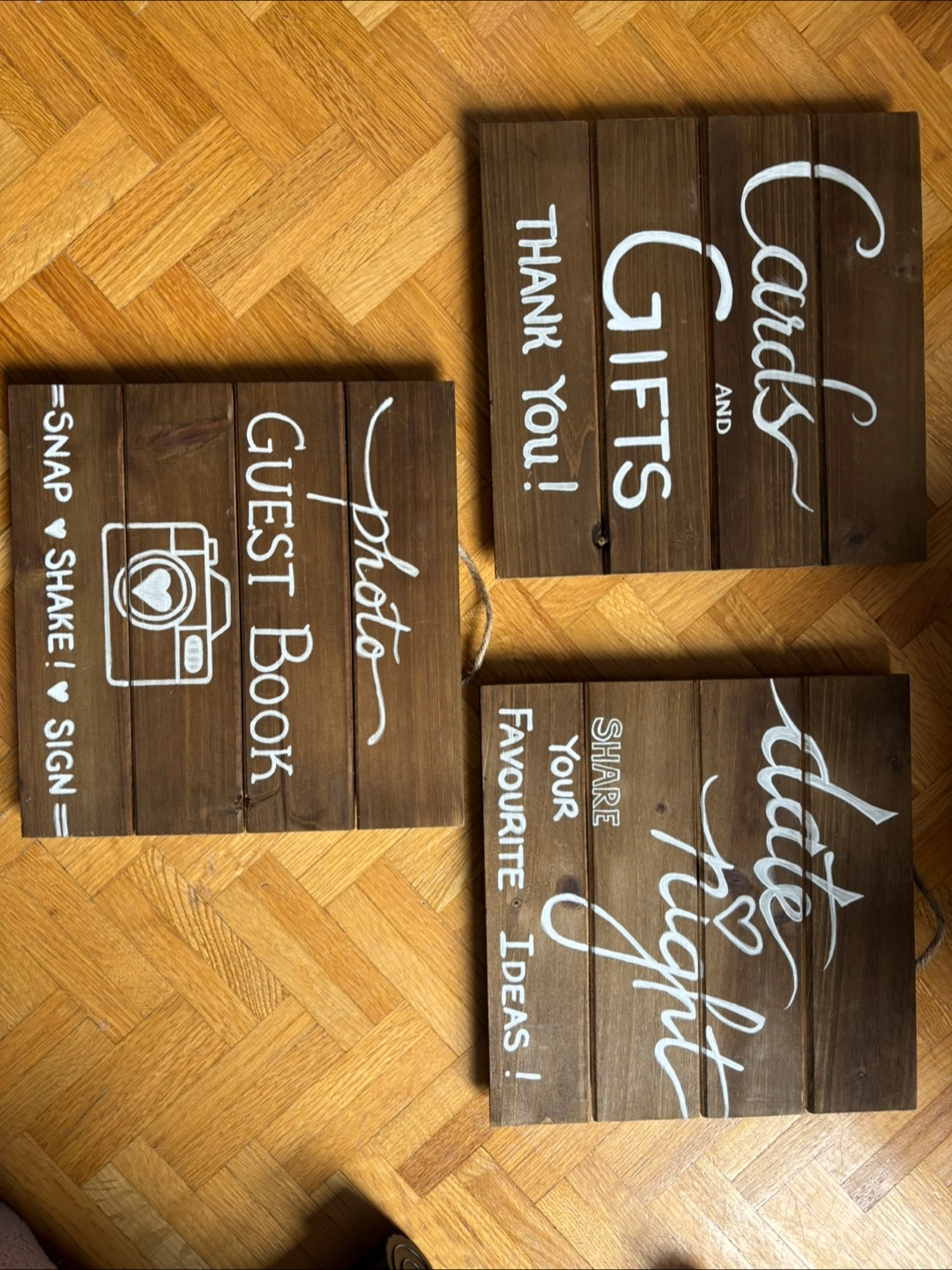 Cheap wedding decor, all items are $10 or less. Would much prefer to sell as a bundle. Message me for bundle price. - Several rustic wooden signs. (I handmade these and would love it if another bride will use them ๐ญ) - 2 blank rustic wooden signs for your DIY - MR & MRS chair/table signs in silver. - Wooden heart shaped guestbook - Flameless LED tealight candles. (2 packs of 24) - Bubble tubes (over 100 in gold and white, gold are pre-filled) - NEW acrylic paint markers. (6 medium, 7 fine) - Ribbons bundle Other items available, message me!