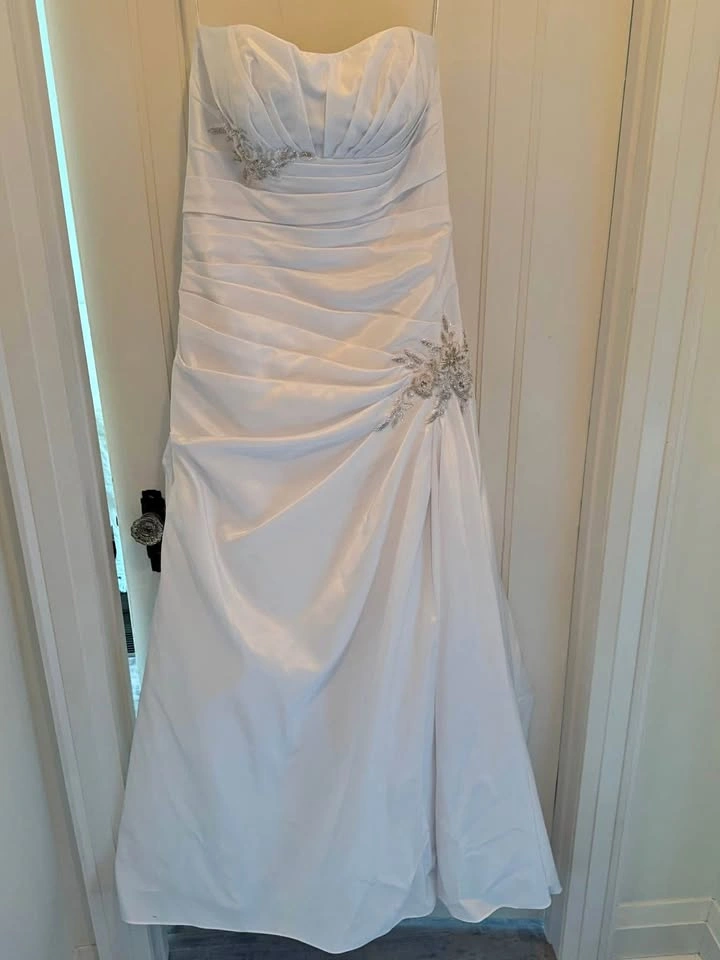 Beautiful David’s Bridal wedding dress (style WG3032). ✔️ Size 12 ✔️ Color: White ✔️ Strapless sweetheart neckline ✔️ Lace-up corset back (adjustable fit) ✔️ Elegant side beading and ruching Worn once, professionally cleaned, and stored with care. From a smoke-free home. Original price was over $600 – letting it go for $175 OBO. 📍 Pick up in Burlington. 💍 Perfect for a bride who wants a timeless, elegant gown without breaking the bank!