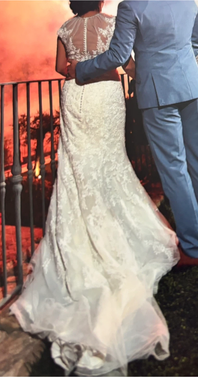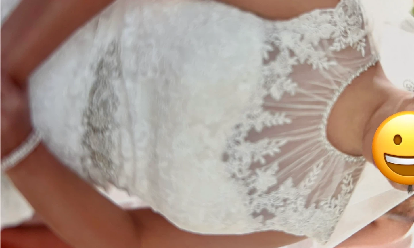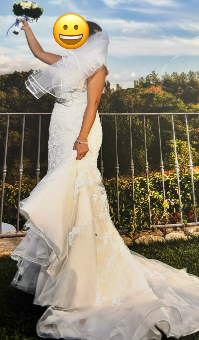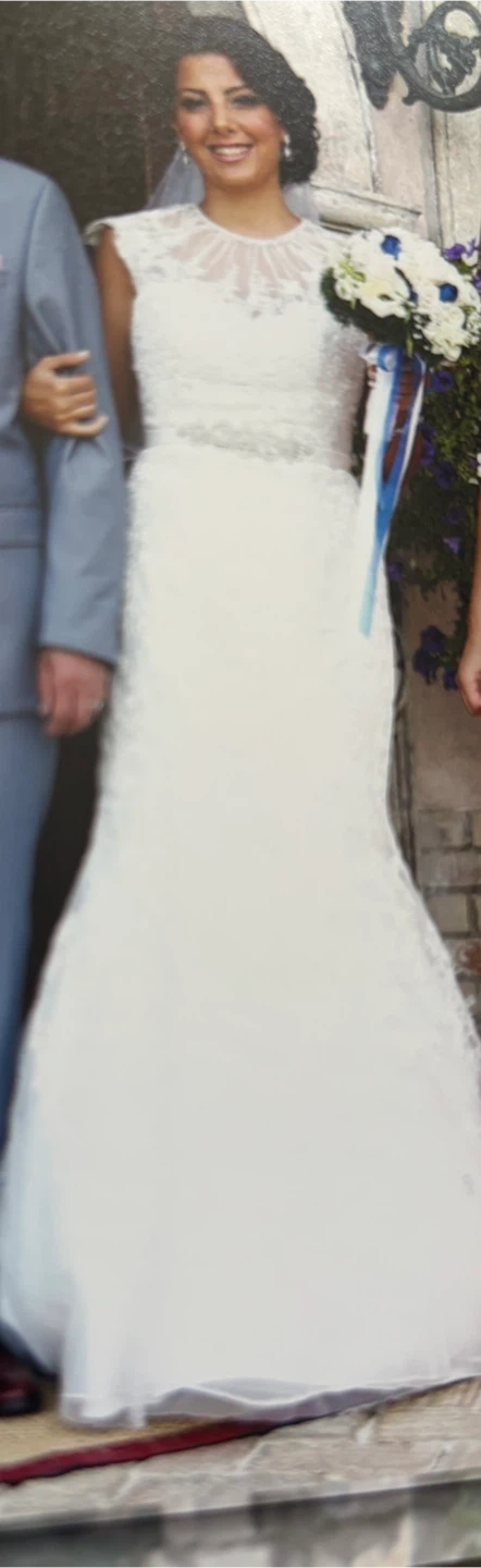 Selling a beautiful wedding dress with a delicate lace overlay. It's in great condition and ready for its next special day! The dress features intricate detailing and a flattering silhouette. Perfect for a bride looking for a classic and timeless look! Included vail!
