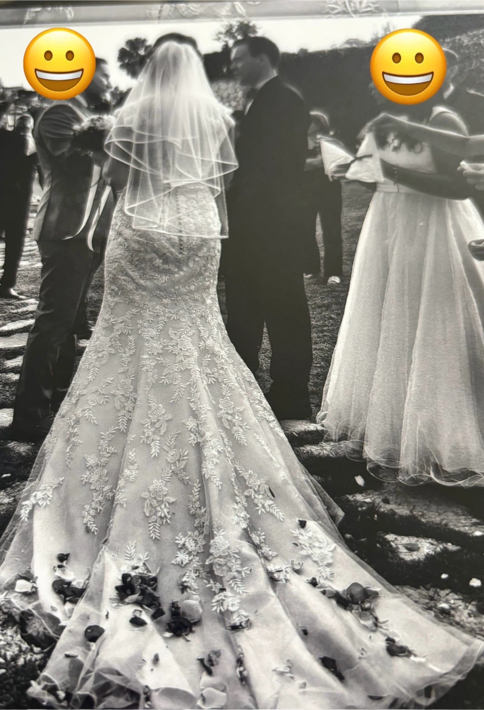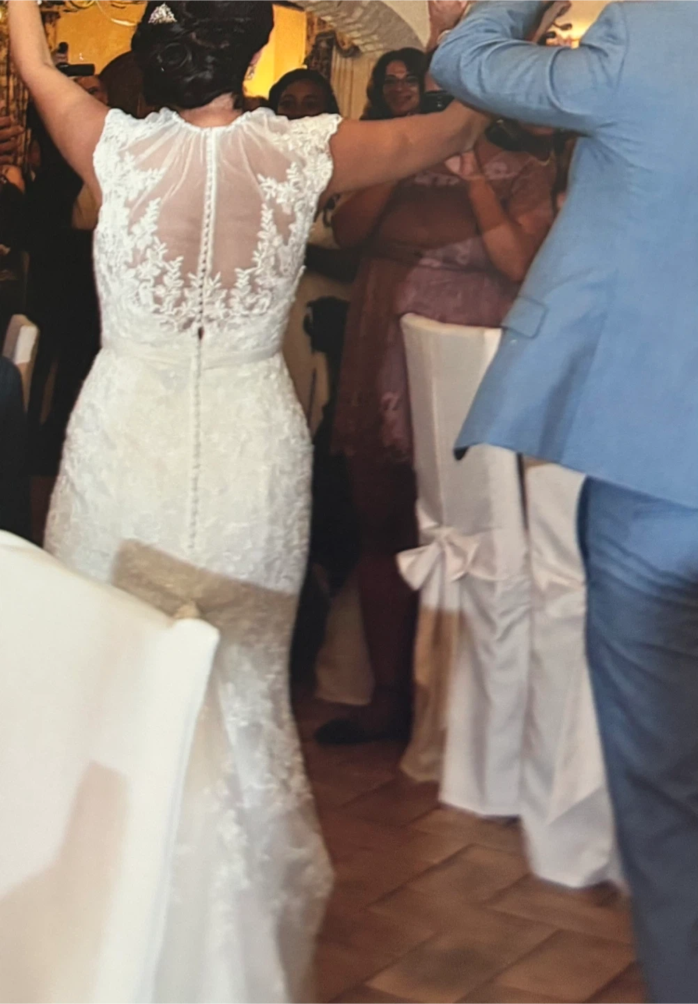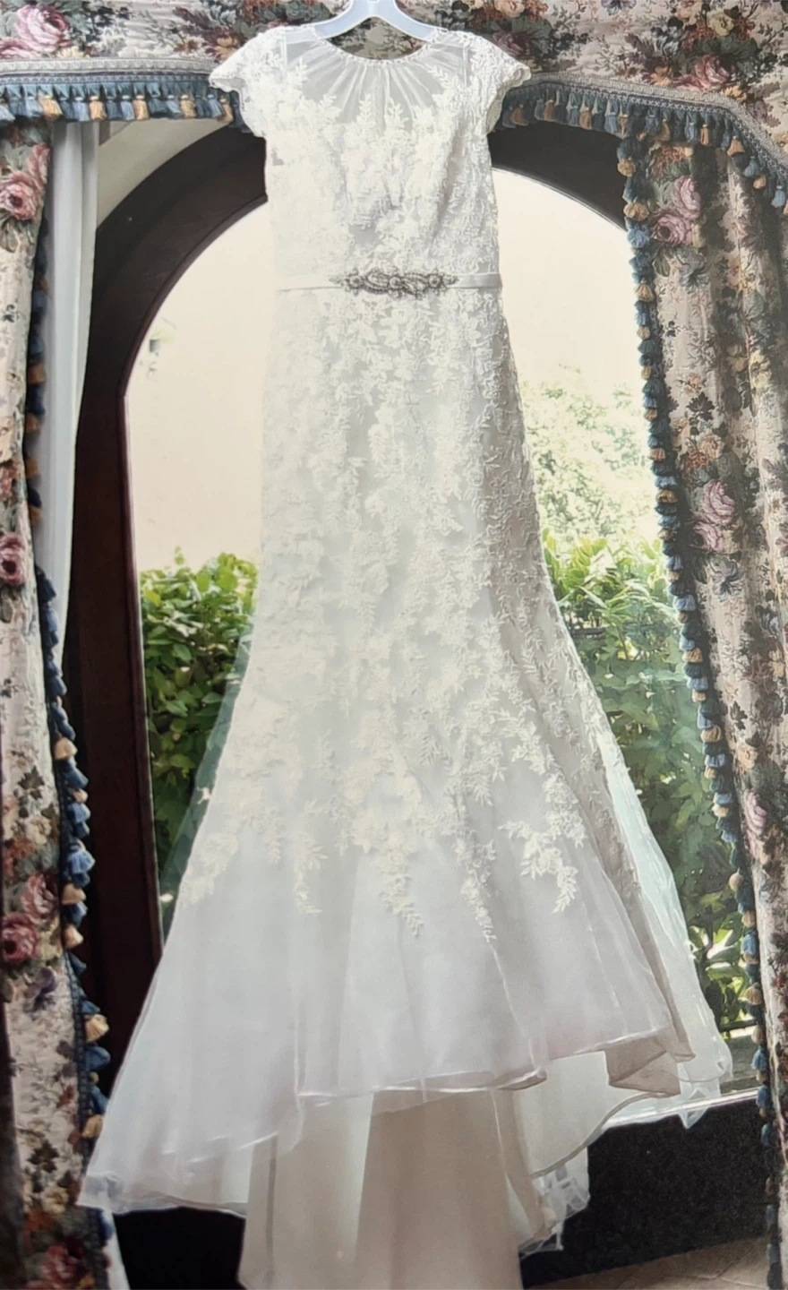 Selling a beautiful wedding dress with a delicate lace overlay. It's in great condition and ready for its next special day! The dress features intricate detailing and a flattering silhouette. Perfect for a bride looking for a classic and timeless look! Included vail!