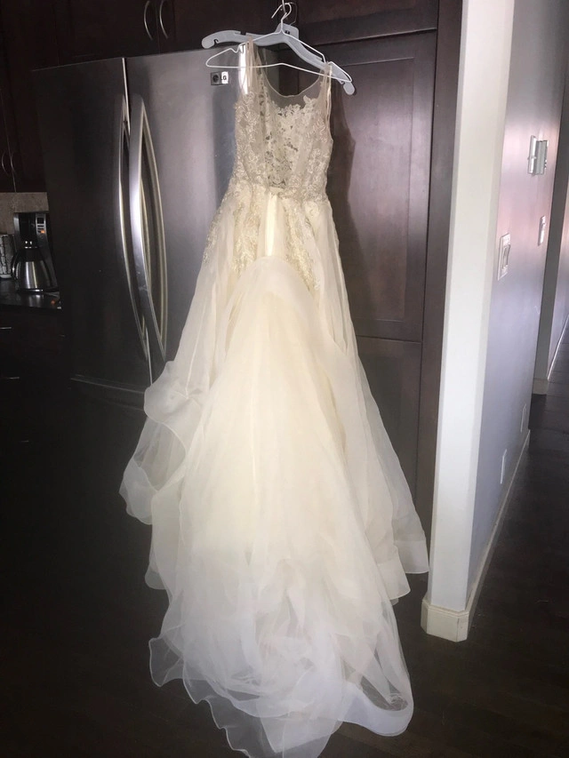 Bought at Novia Mia Bridal in Red Deer on sale for $2000. Has been safely stored in garment bag! Feel free to message if you have any questions!