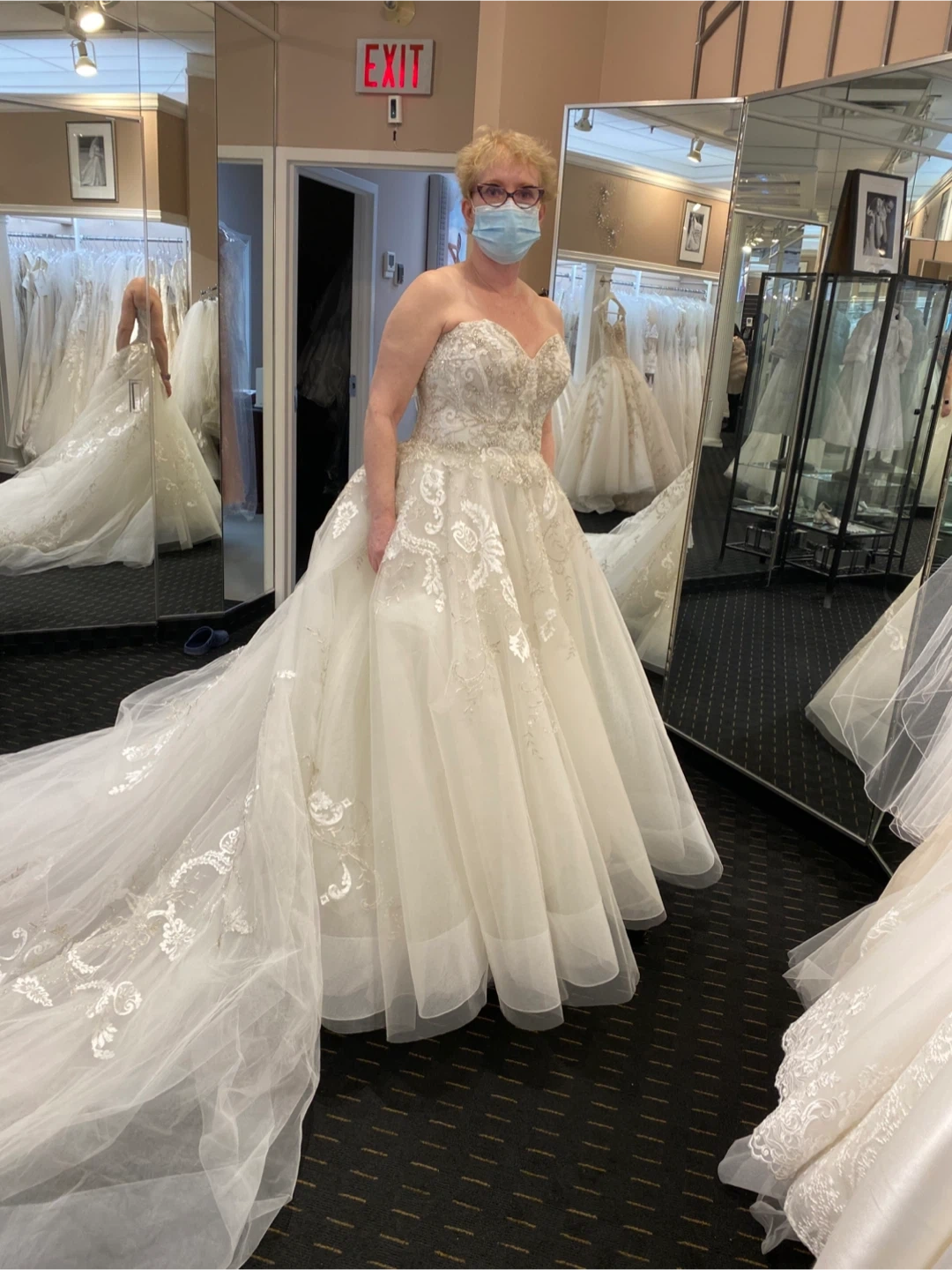 Designer is Casablanca, size 14 beautiful ballroom style dress Comes with long veil and petticoat.