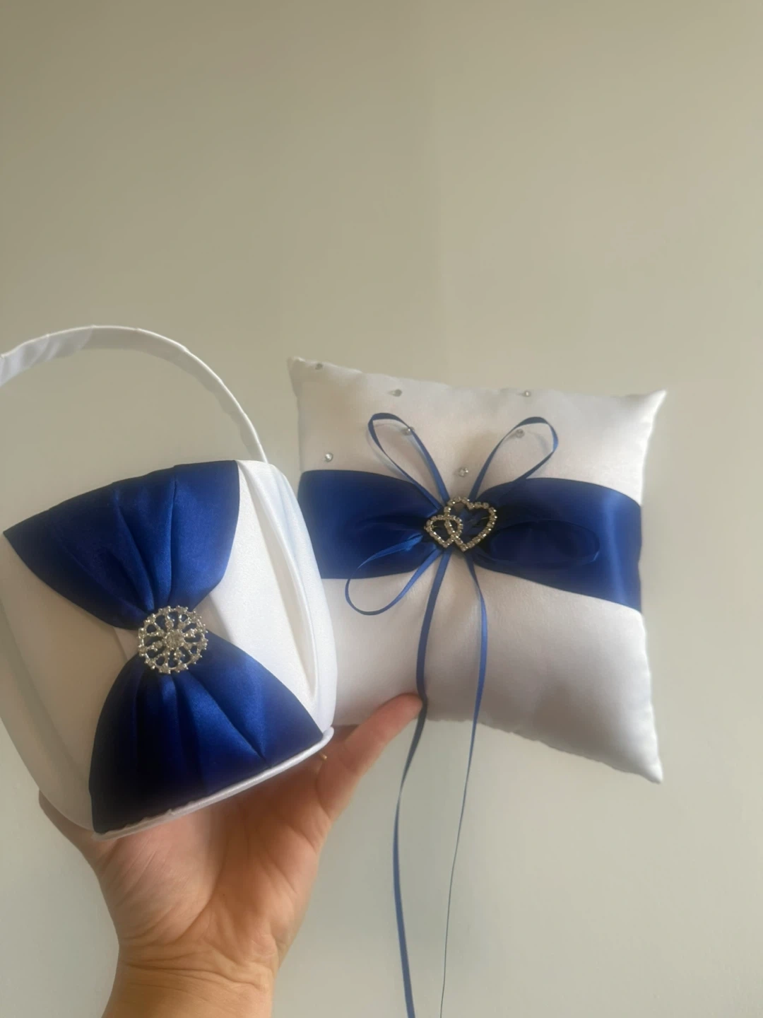 This is a beautiful set that includes a wedding ring pillow and a flower girl basket. Both are decorated with white and blue satin and rhinestone accents. They would be perfect for a traditional wedding ceremony