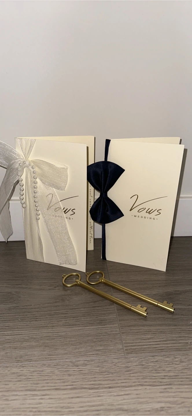 Wedding vow books with decorative ribbons and gold-coloured keys. Perfect for your special day!