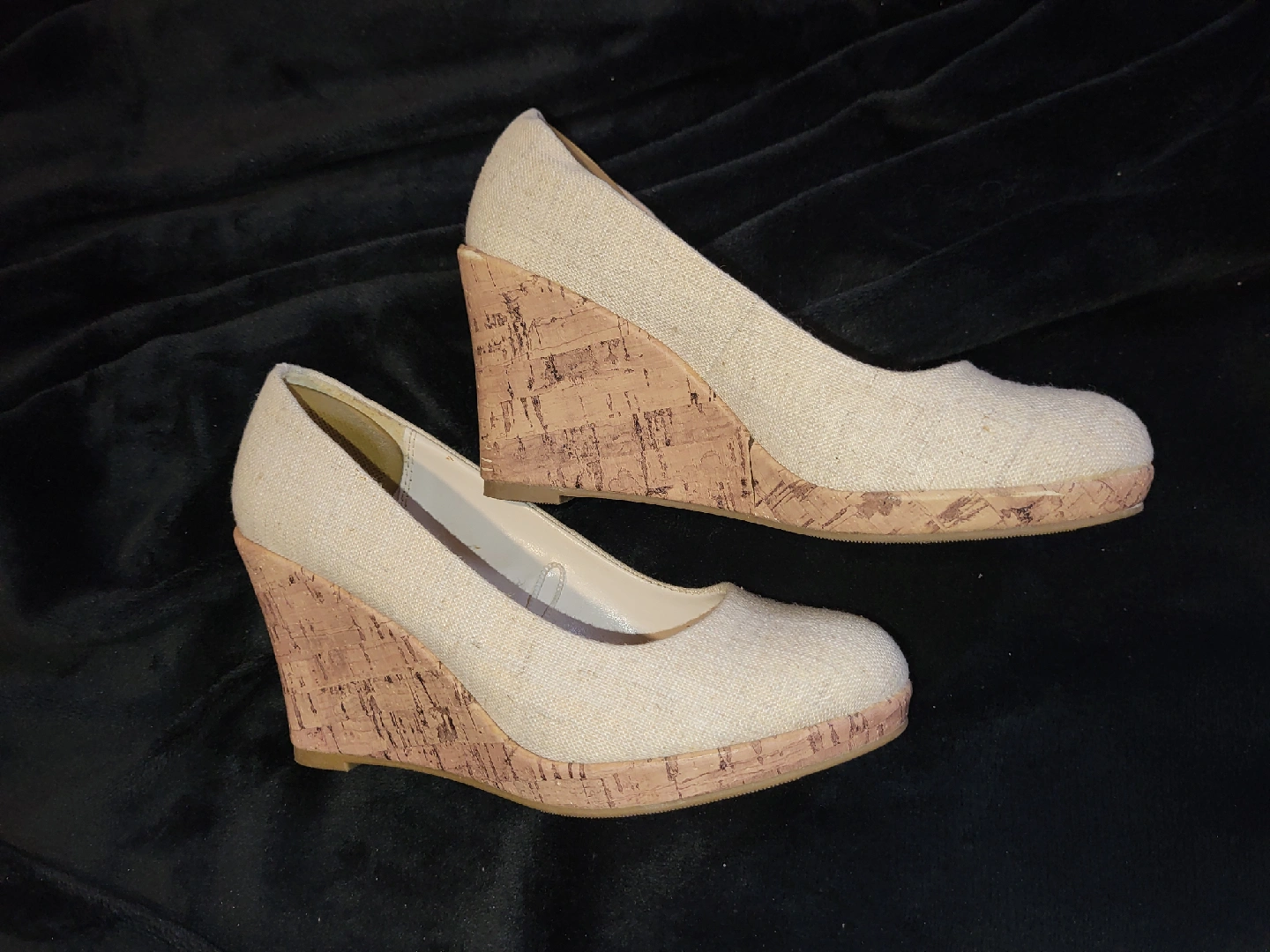 Cute pair of wedge heel shoes! They are a size 5 and appear to be in good condition. The outer material is a light-coloured fabric with a cork-style wedge heel. Perfect for adding a bit of height and style to your outfit!