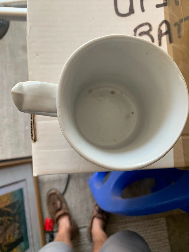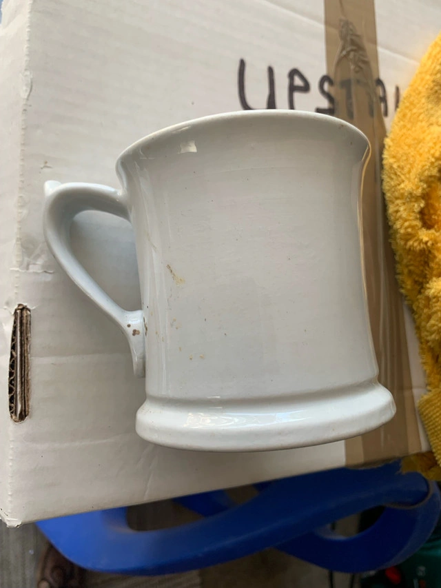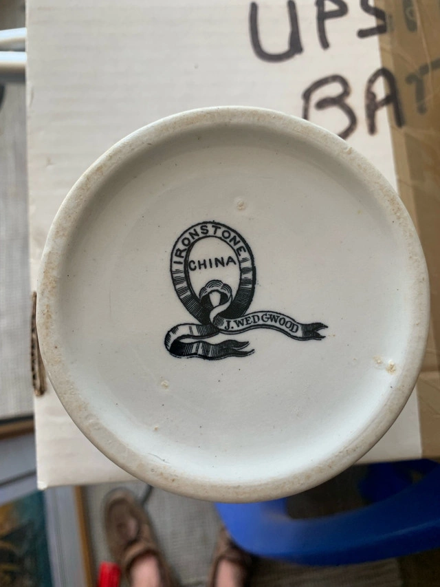 This is a white Wedgwood Ironstone China mug, perfect for coffee or tea. This mug is used with some cosmetic imperfections, but is in good condition overall. Here are the details: * Brand: J. Wedgwood * Material: Ironstone China * Colour: White
