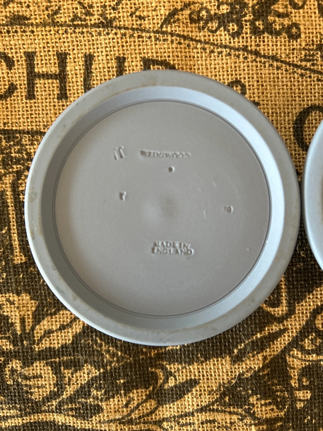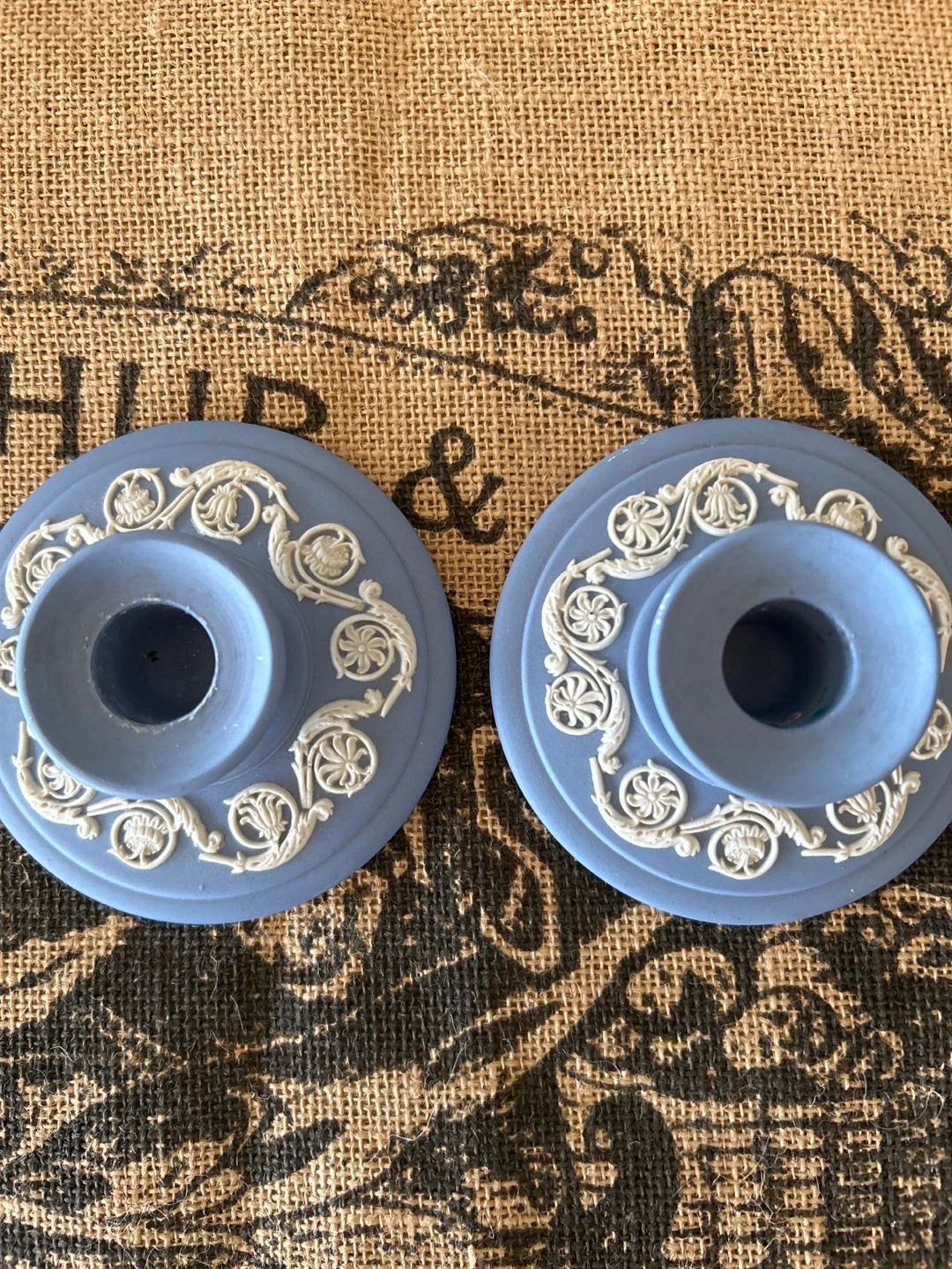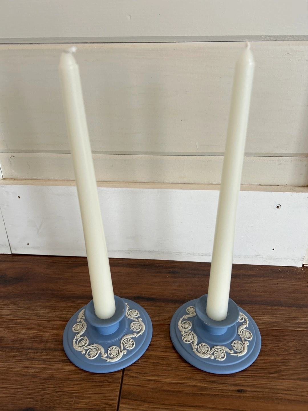 I'm selling a pair of Wedgwood Jasperware candlestick holders. They're a lovely shade of blue with intricate white detailing. Made in England, these are a rare find! Originally listed for $47 each.