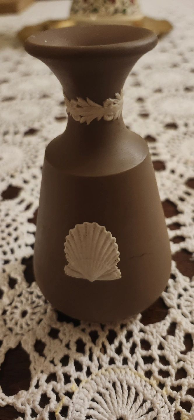 Selling a lovely Wedgwood Jasperware bud vase in a unique brown colour! It features the classic Jasperware design with a shell and floral accents. Perfect for adding a touch of elegance to any room