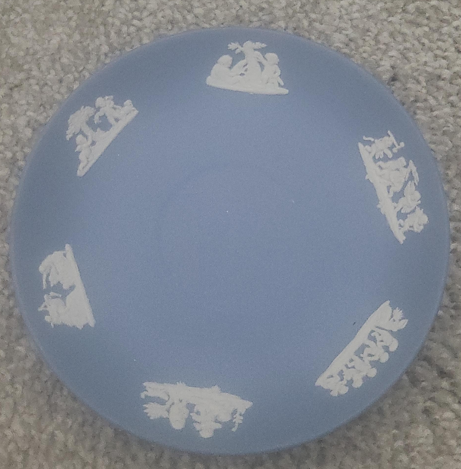 A lovely Wedgwood Jasperware plate in light blue with white neoclassical designs. It's in great condition and would make a beautiful addition to any collection or a charming decorative piece for your home could use a clean