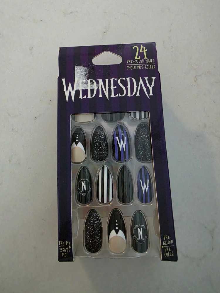 Selling a pack of Wednesday pre-glued nails! It comes with 24 nails with a variety of designs, including stripes, glitter, and the letter 'W' and 'N' designs