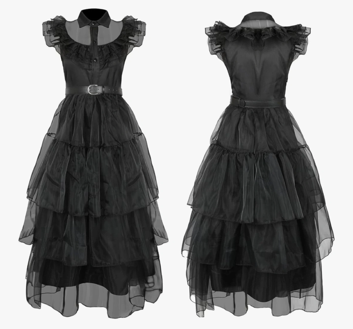 This is a black dress inspired by Wednesday Addams. It features a tiered skirt and comes with a belt. Perfect for cosplay or a unique fashion statement!all accessories are included