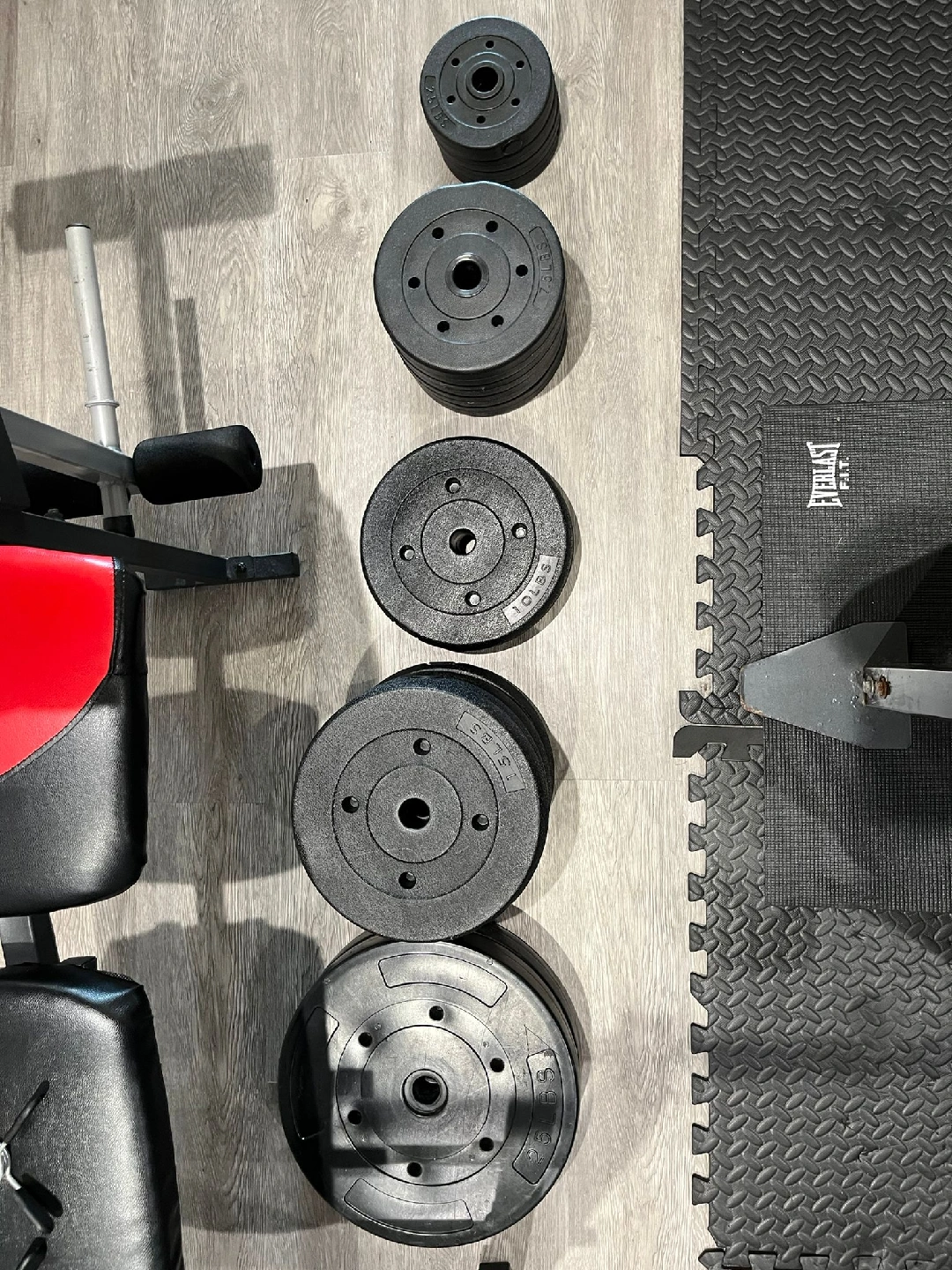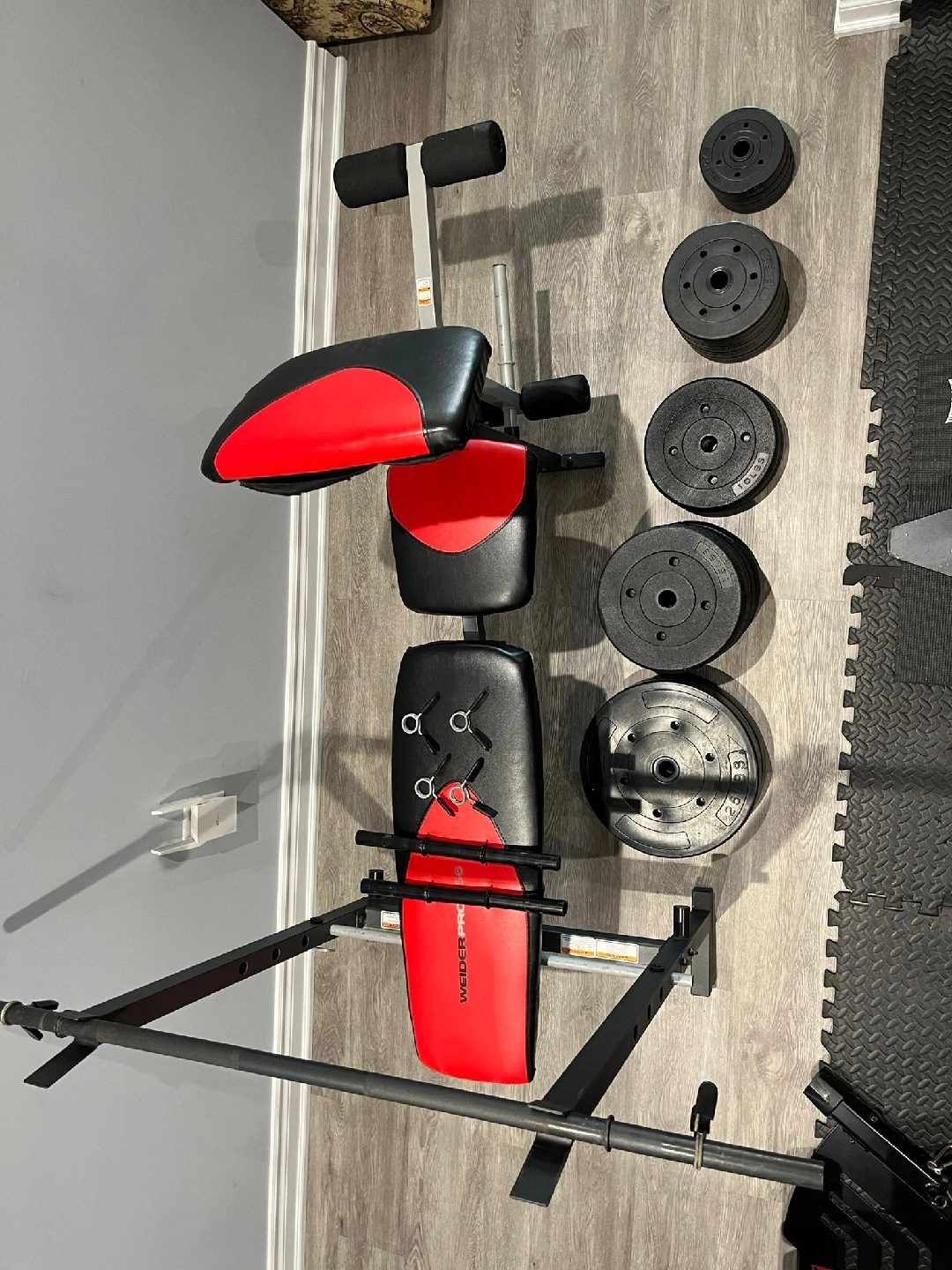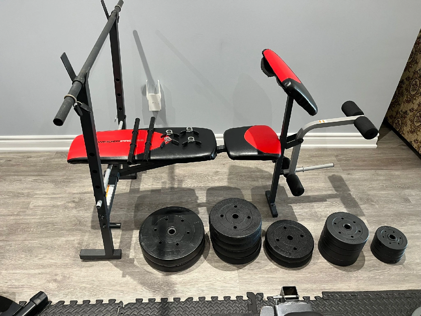 Selling a Weider Pro weight bench with a set of weights. It's in good condition and ready for your home gym! Includes various weight plates for a comprehensive workout.