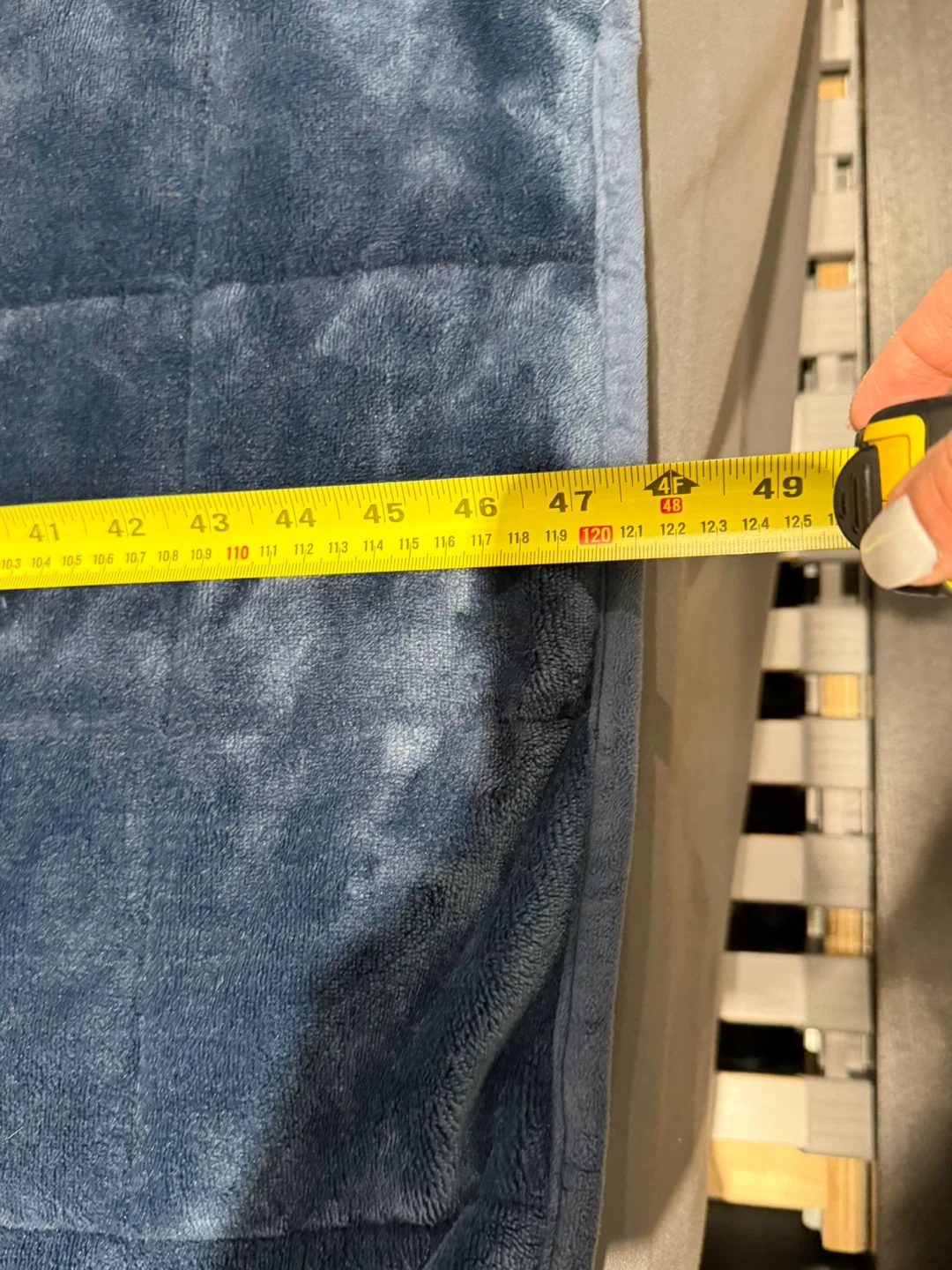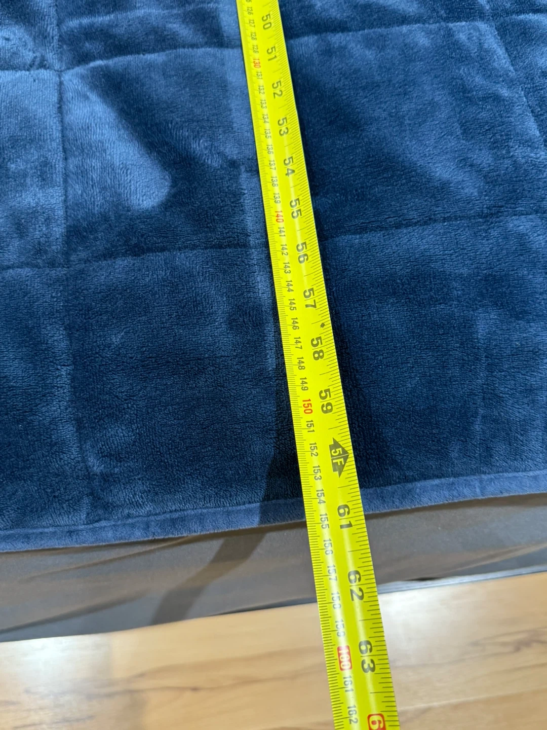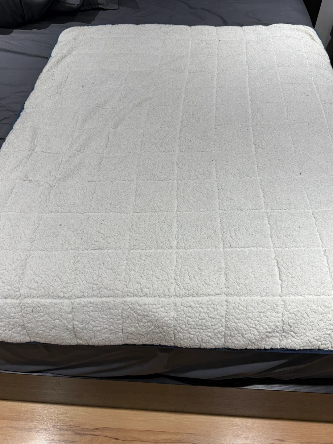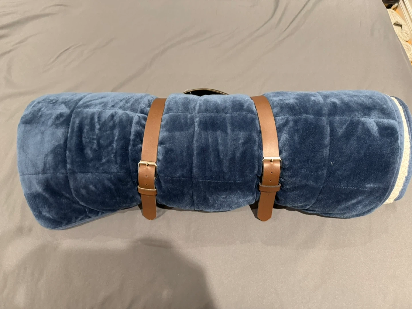 Double-sided weighted blanket. One side features a sherpa fleece material, the other a soft, plush material. Features two leather straps for easy storage and transport.
