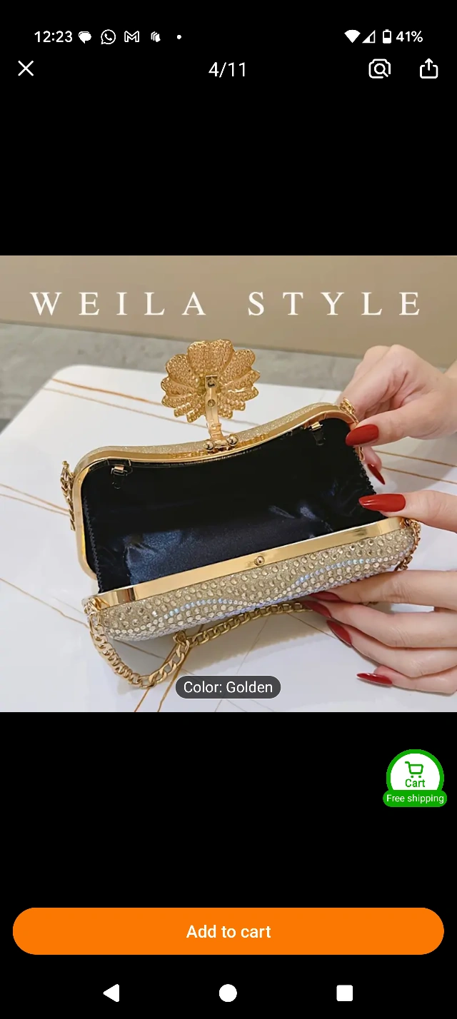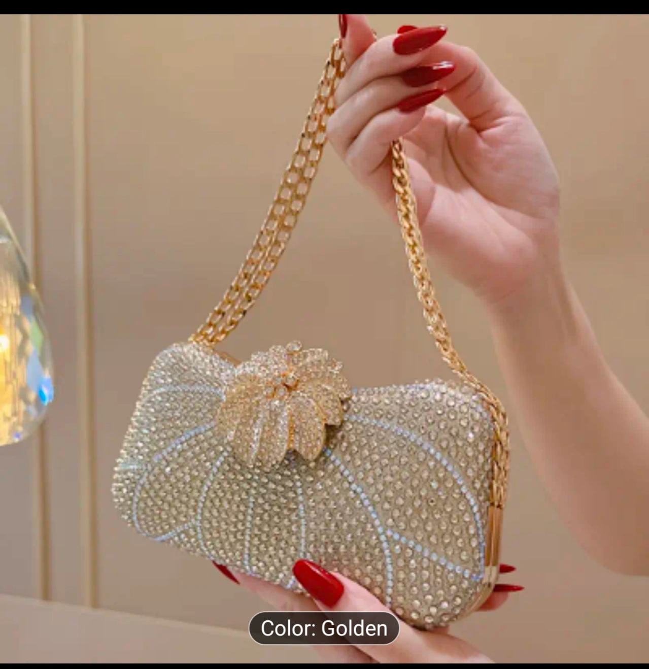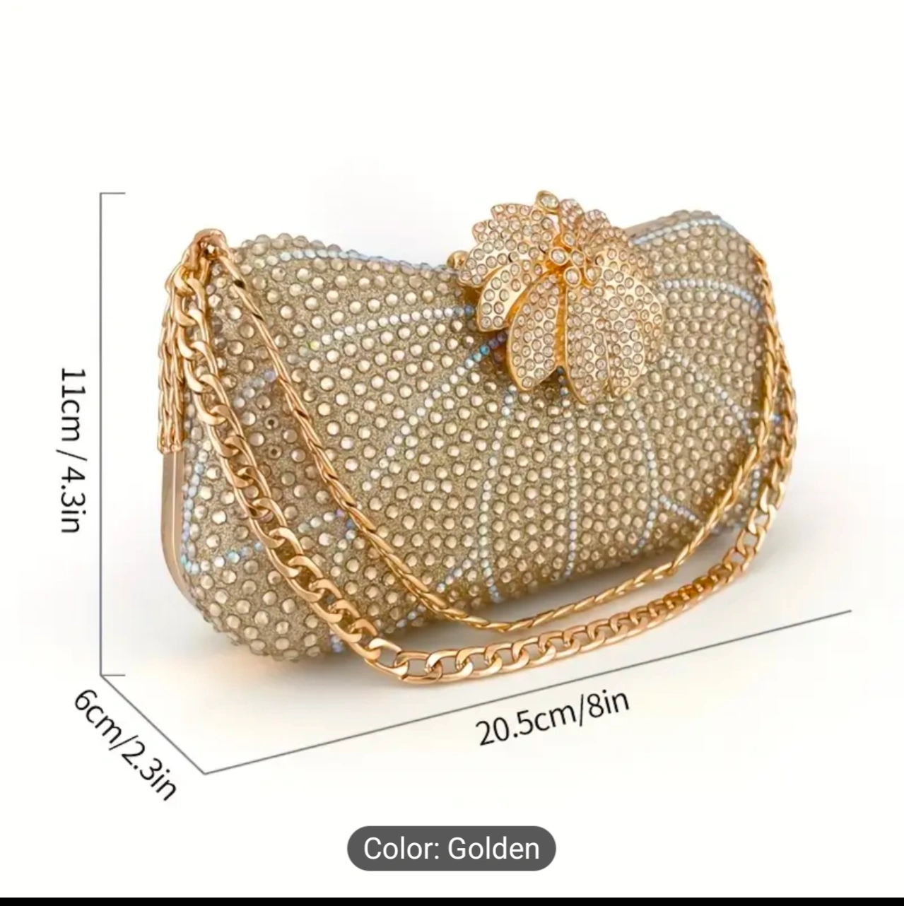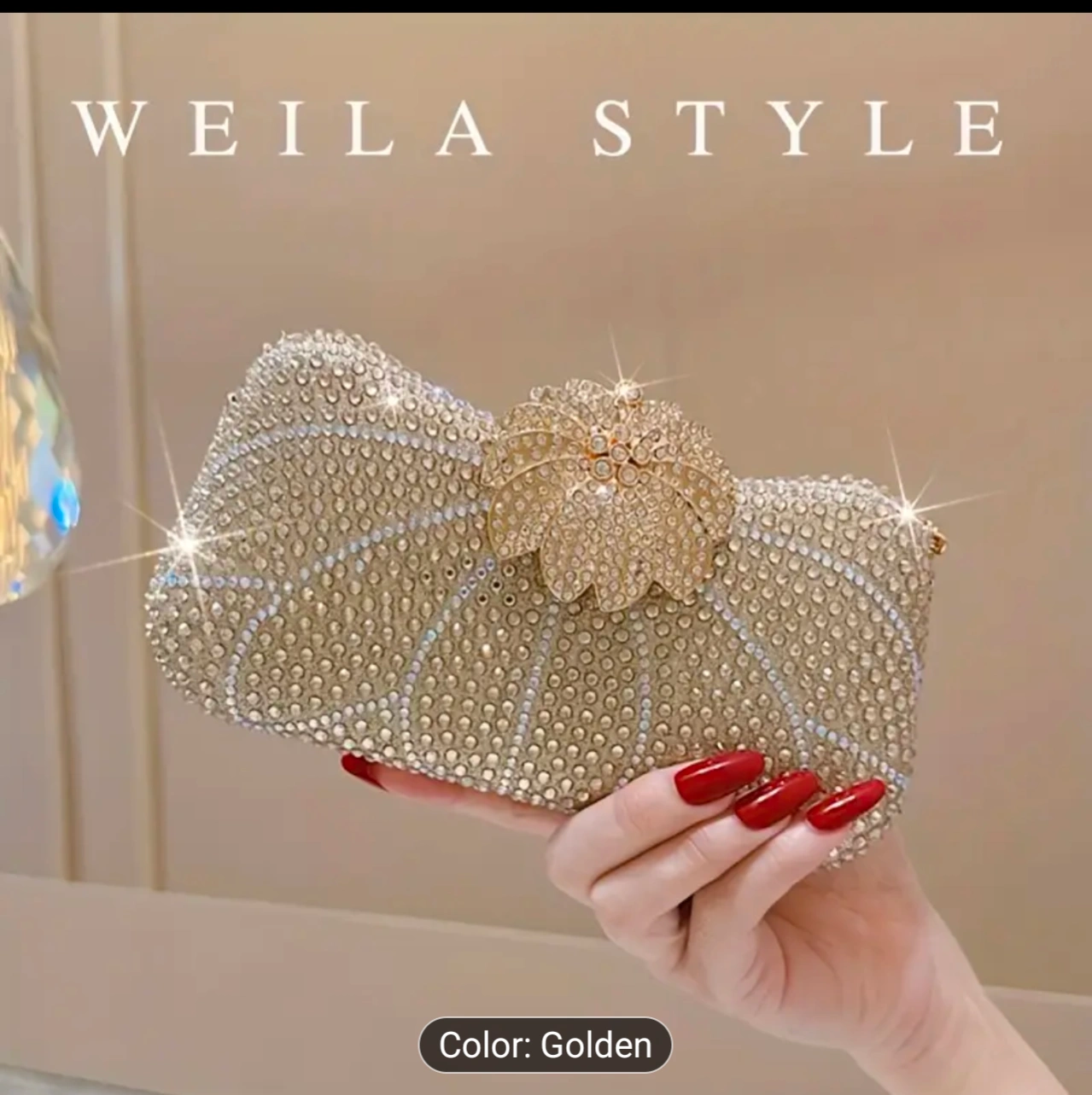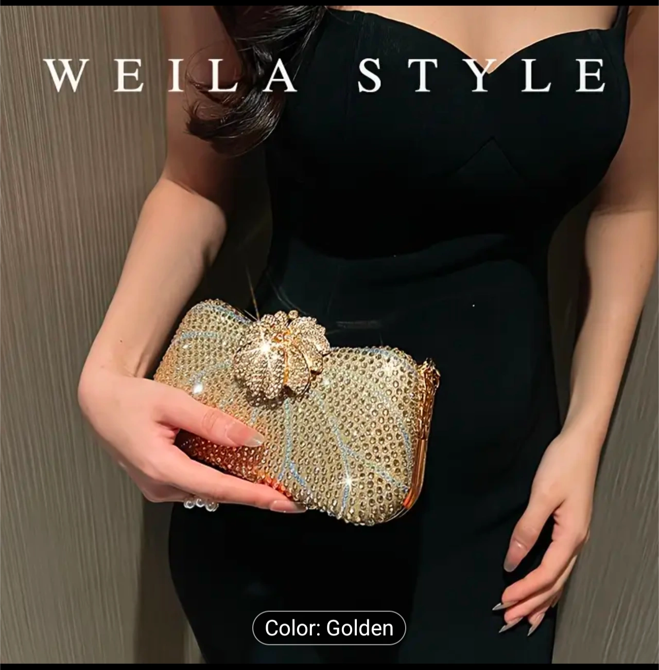 BRAND NEW This Weila Style clutch is perfect for a night out! It features a beautiful golden colour and is adorned with rhinestones. The approximate dimensions are 20.5cm x 11cm x 6cm