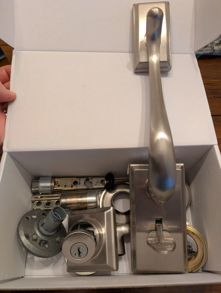 Weiser Front door hardware kit. Includes all components. Satin nickel finish. Perfect for new installations or replacements.