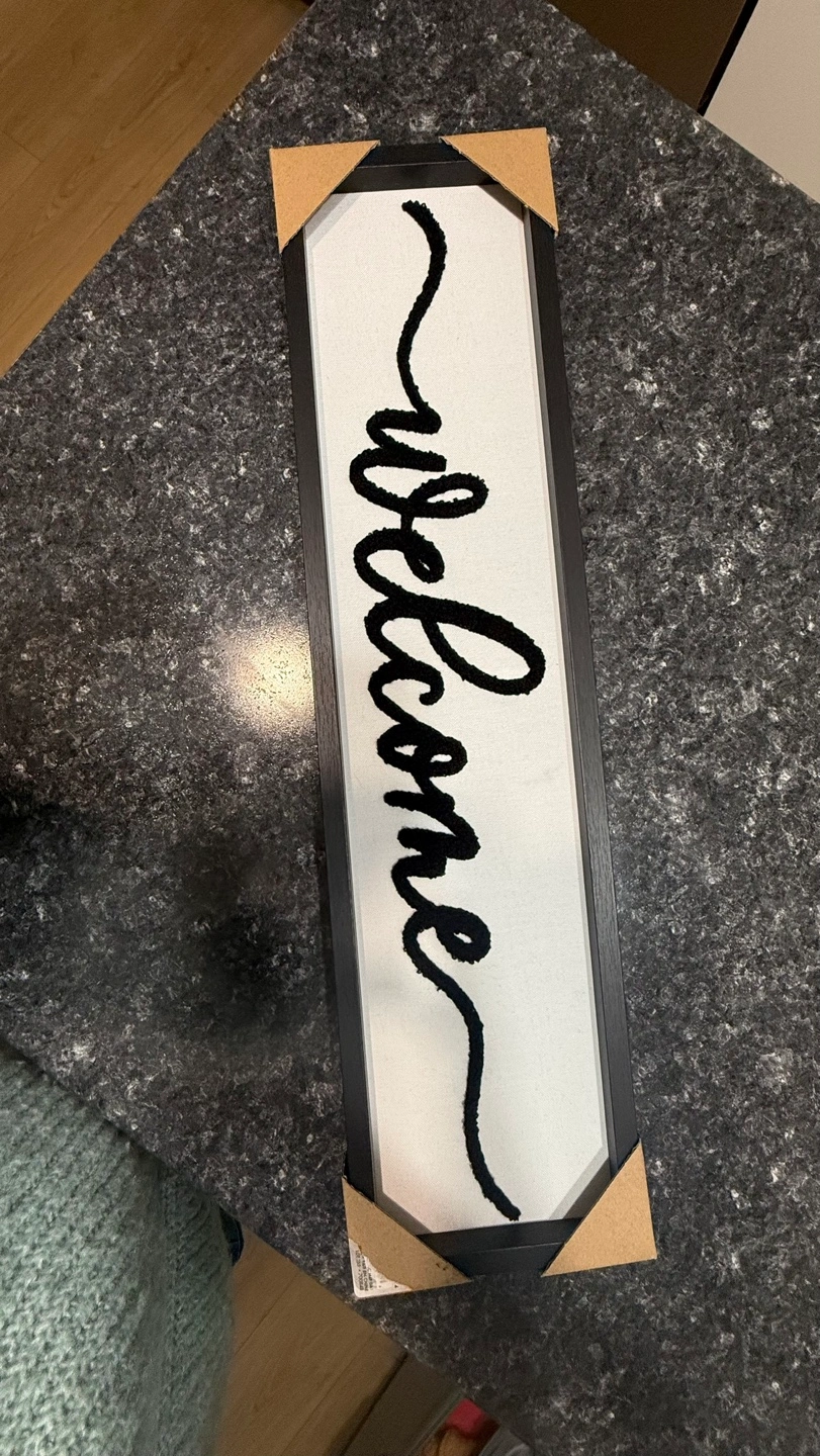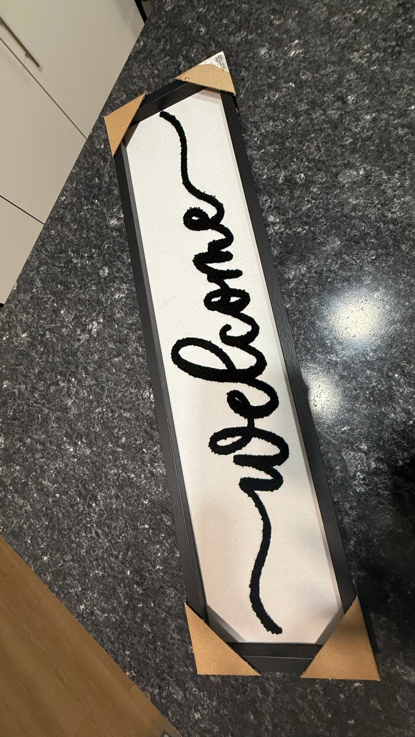 Long rectangular welcome sign. Black frame and black cursive welcome lettering on a white background. New, still in packaging. Pick up at 90 Runneymeade Rd,Riverview #thrifty