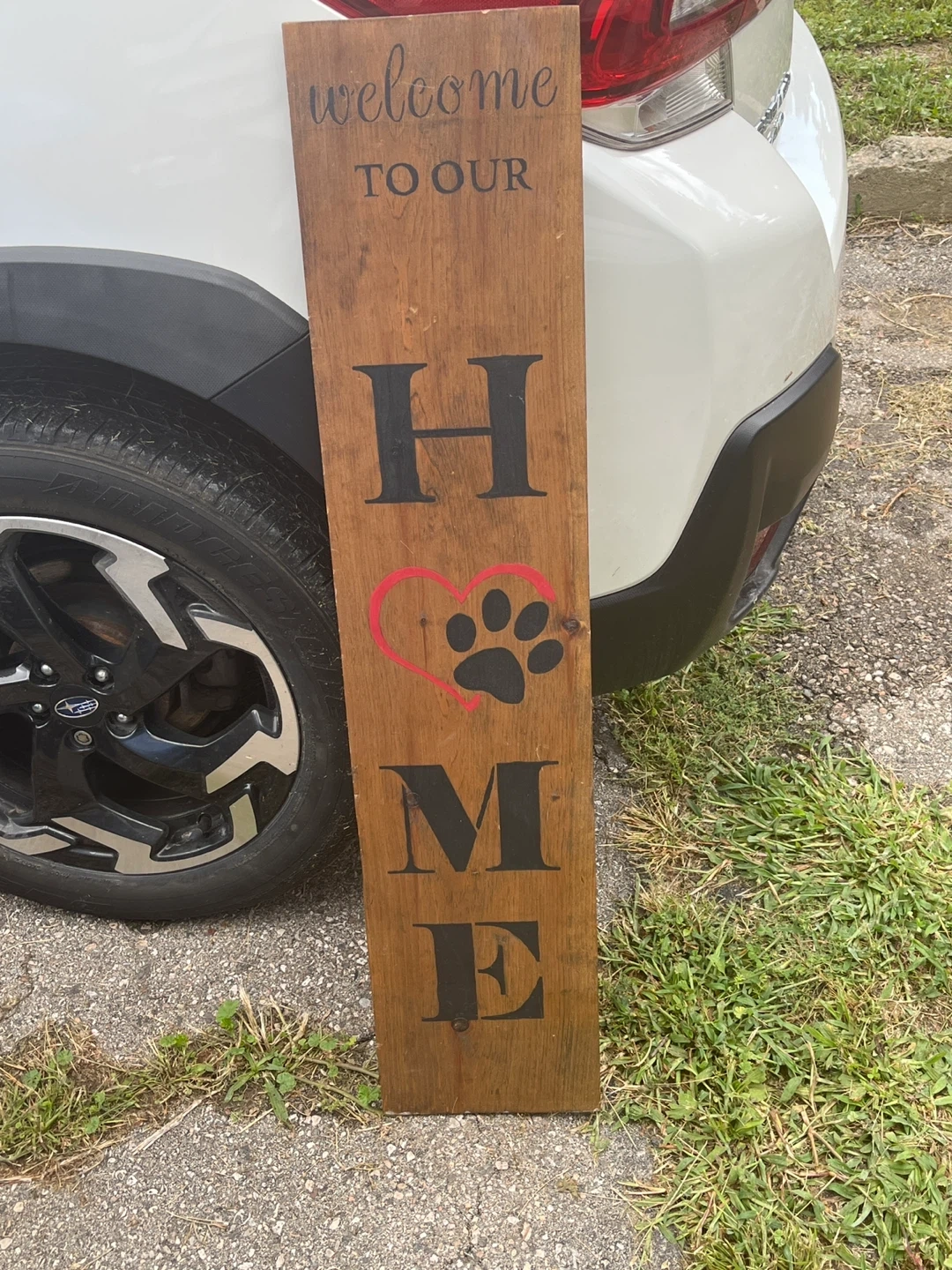 A cute welcome sign made for pet lovers, has small scratches on it but doesn’t take away from its cute animal lover features. Colour: brown wood material Years owned: 5