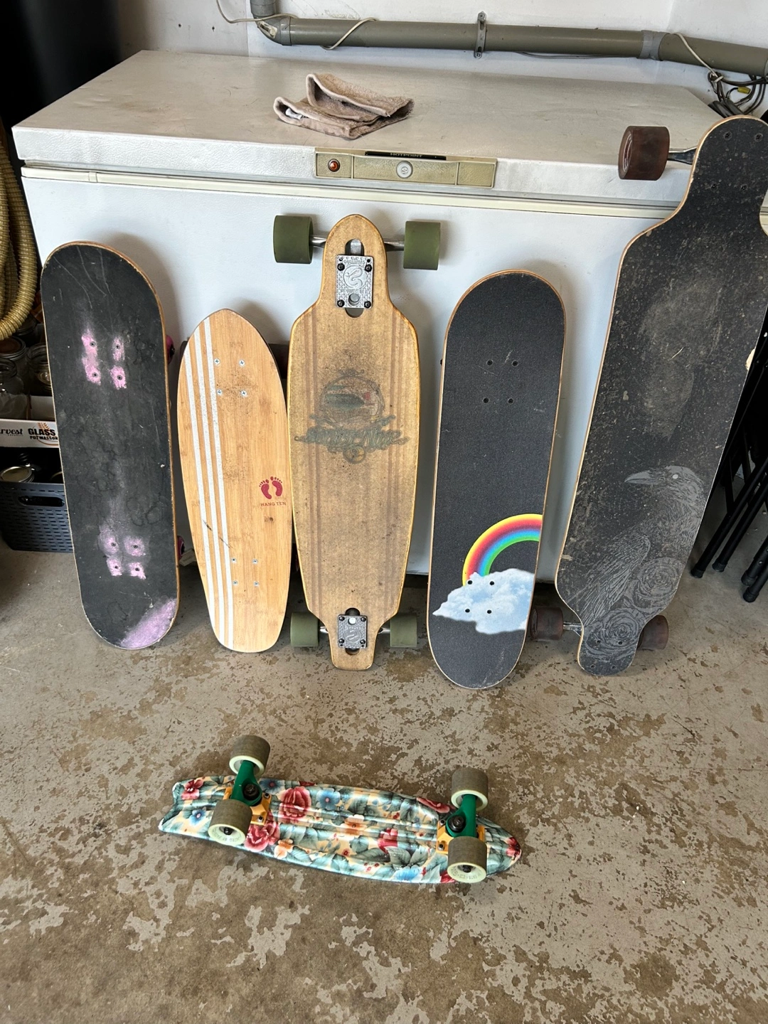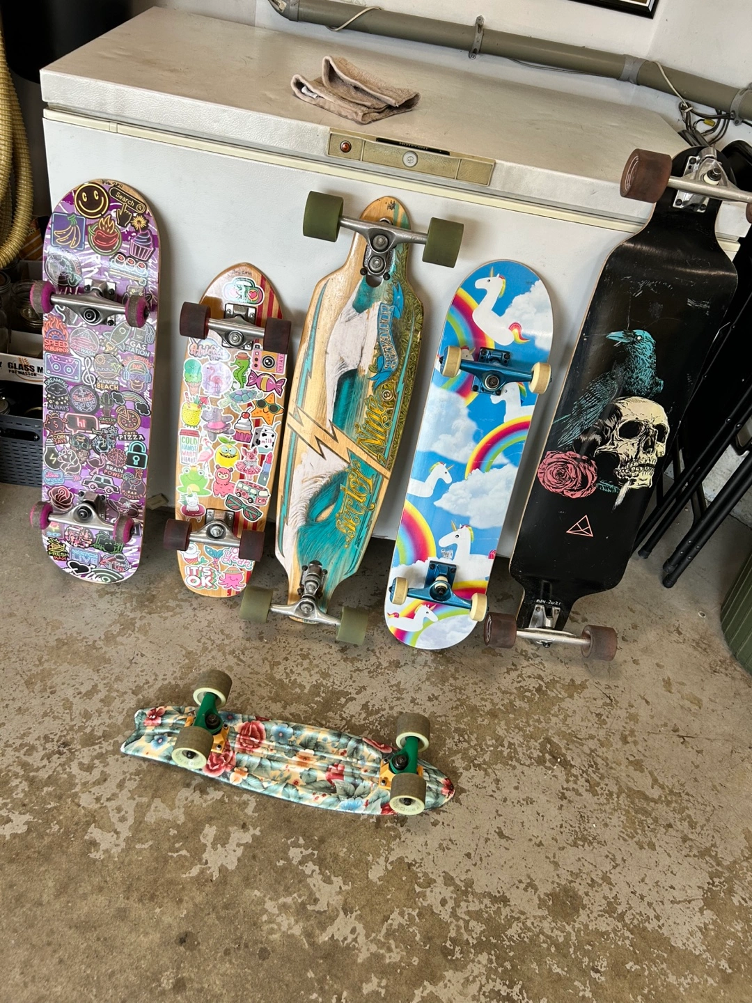 selling multiple well loved skateboards and longboards. various pricing for each one between $5 for the penny board in front, to $50 for the middle and far right. they’re dirty but i promise they’re still in great condition. willing to negotiate price. sold : unicorn / cloud board