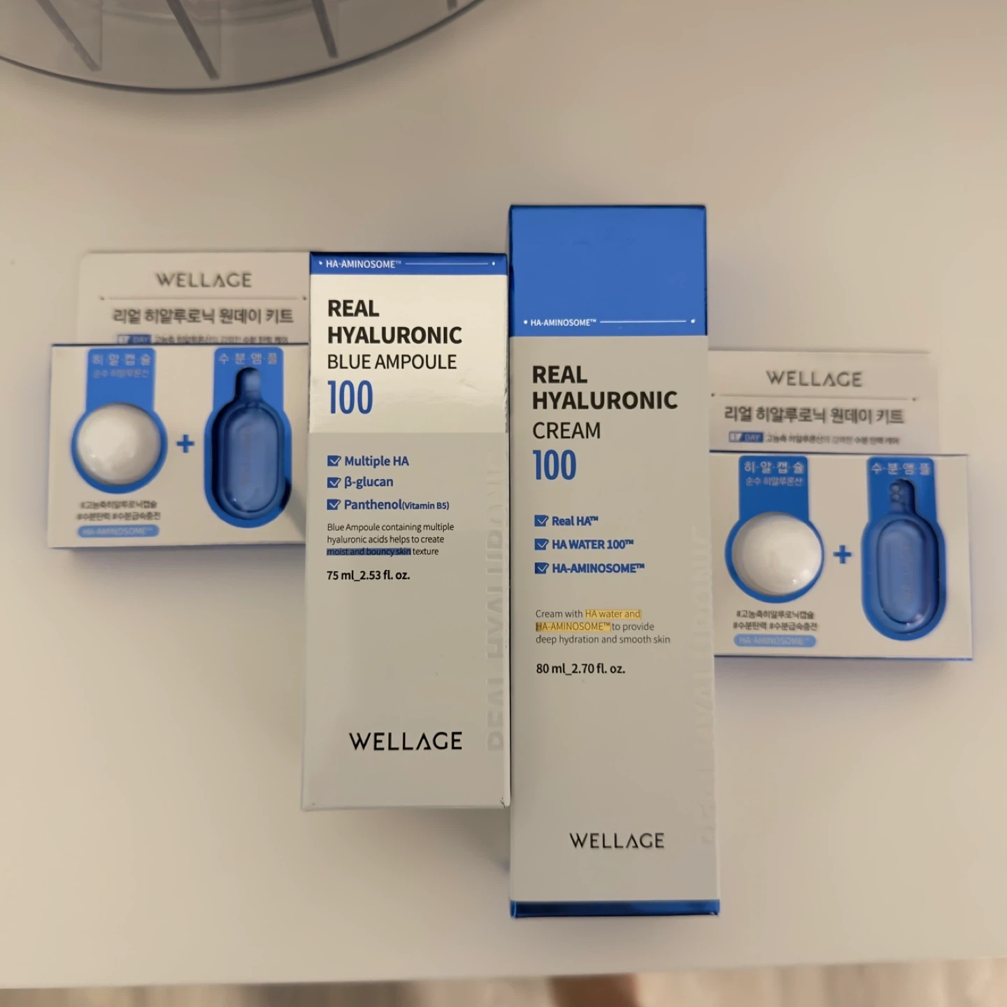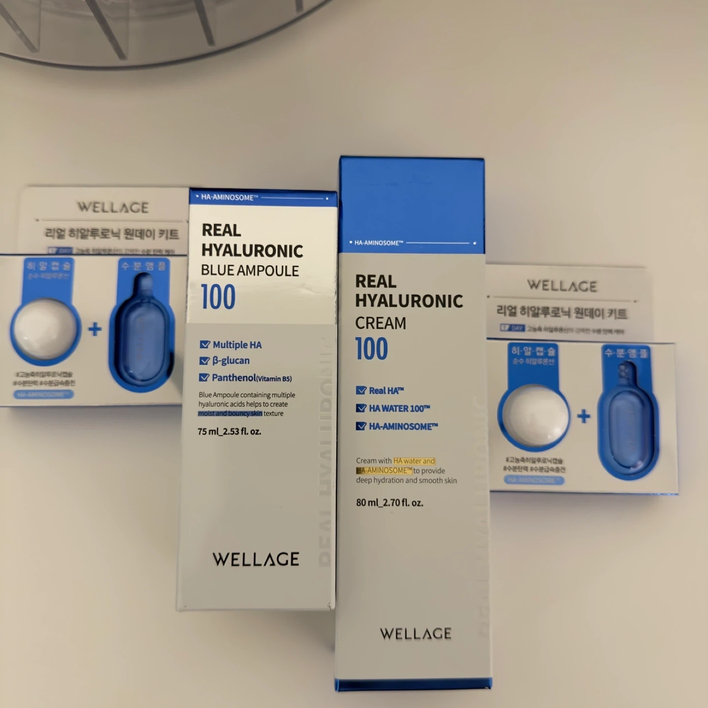 Selling a WELLAGE set that includes the Real Hyaluronic Blue Ampoule 100 (75ml) and the Real Hyaluronic Cream 100 (80ml) The ampoule contains multiple HA, B-glucan, and Panthenol (Vitamin B5) to help create a moisturized and bouncy skin texture The cream is formulated with HA WATER 100™ and HA-AMINOSOME™ to provide deep hydration and smooth skin