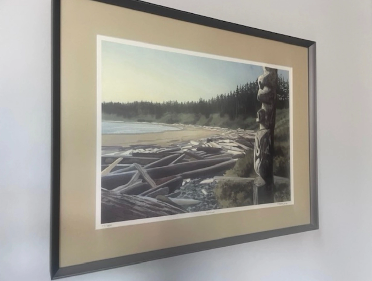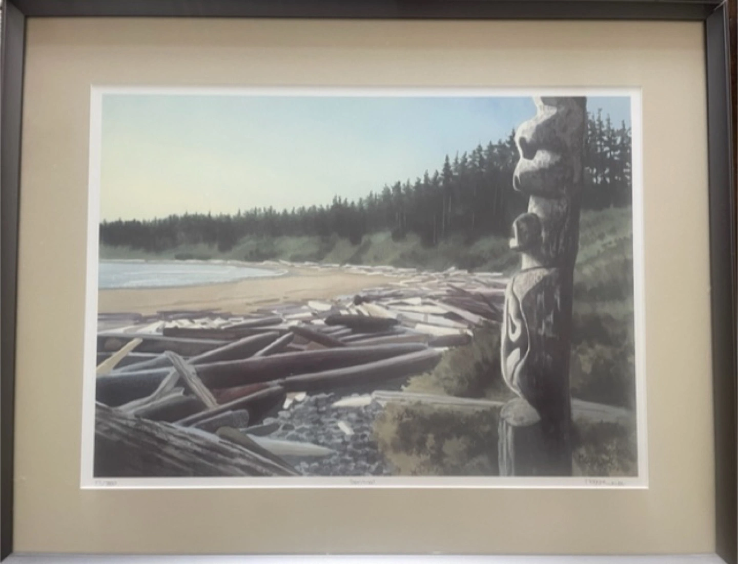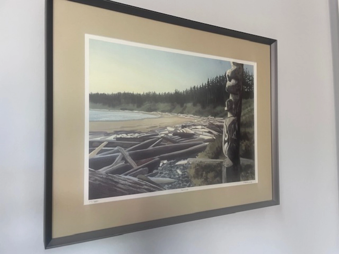 West Coast Artist Watercolour Print Artist: Maggie White Title: Sentinel Print Edition: 17 / 350 Framed Size: 14.75 x 18.75 in - professionally framed in bronze metal patina, sand colour mat, and non reflective museum/gallery glass Print Size: 10 x 14 actual print (not including white border)