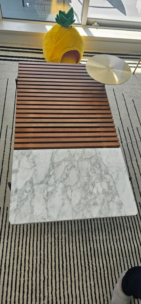 Beautiful coffee table with a sleek design. Featuring a wooden and marble top. It would be a great addition to your living space, perfect to use while relaxing with a book and a cup of tea. PRICE: $250 Pick-up only (near Metrotown)