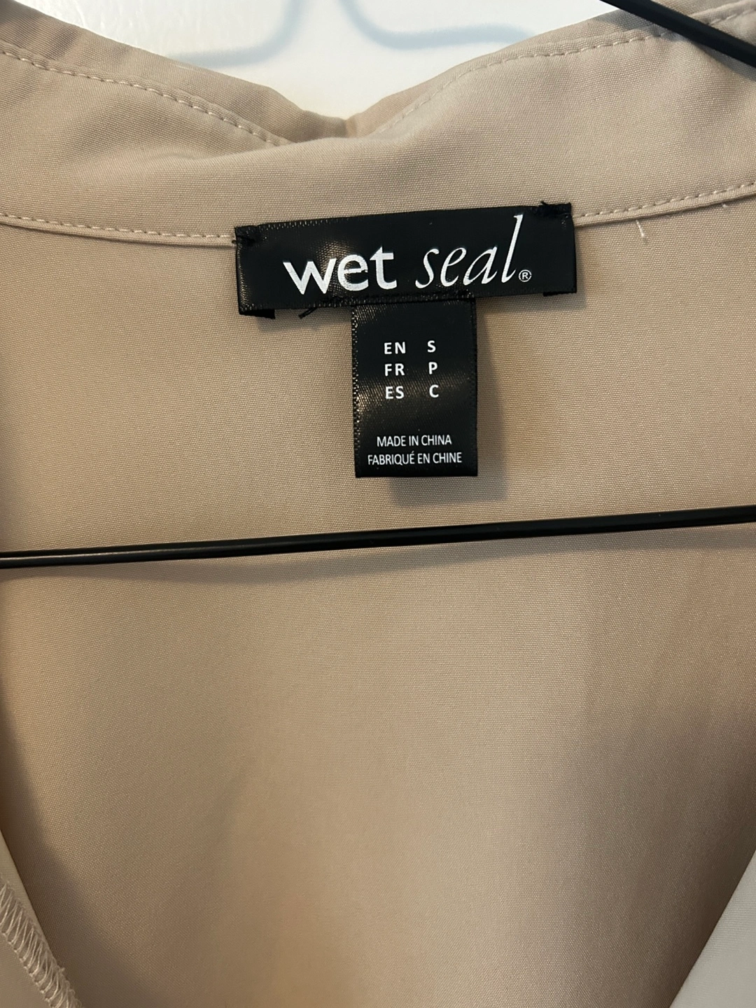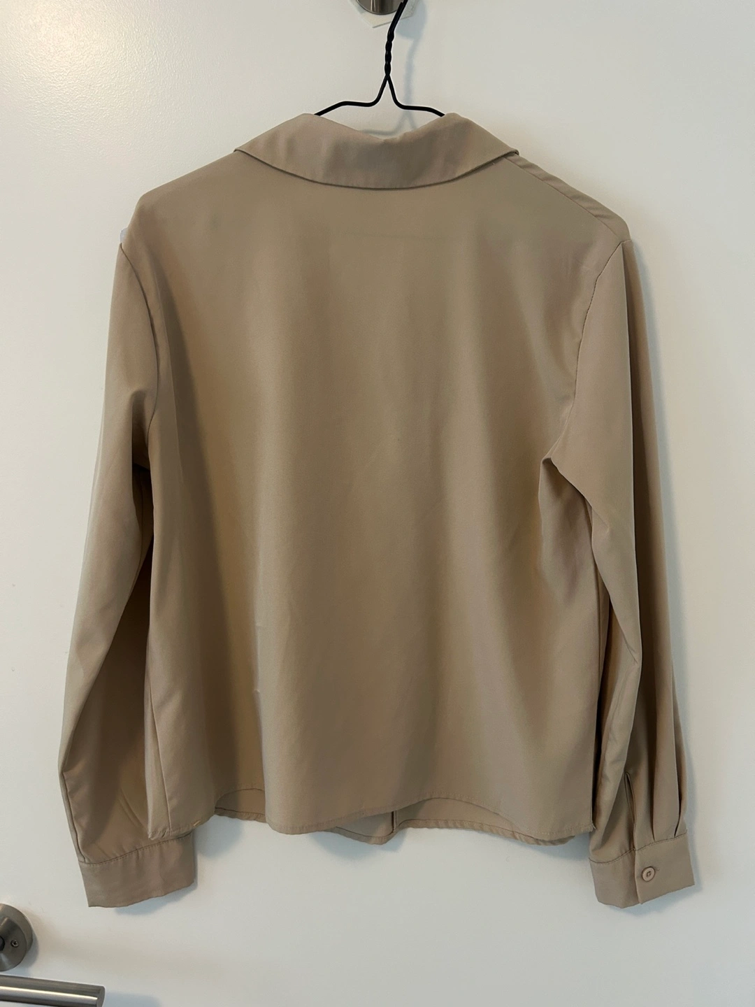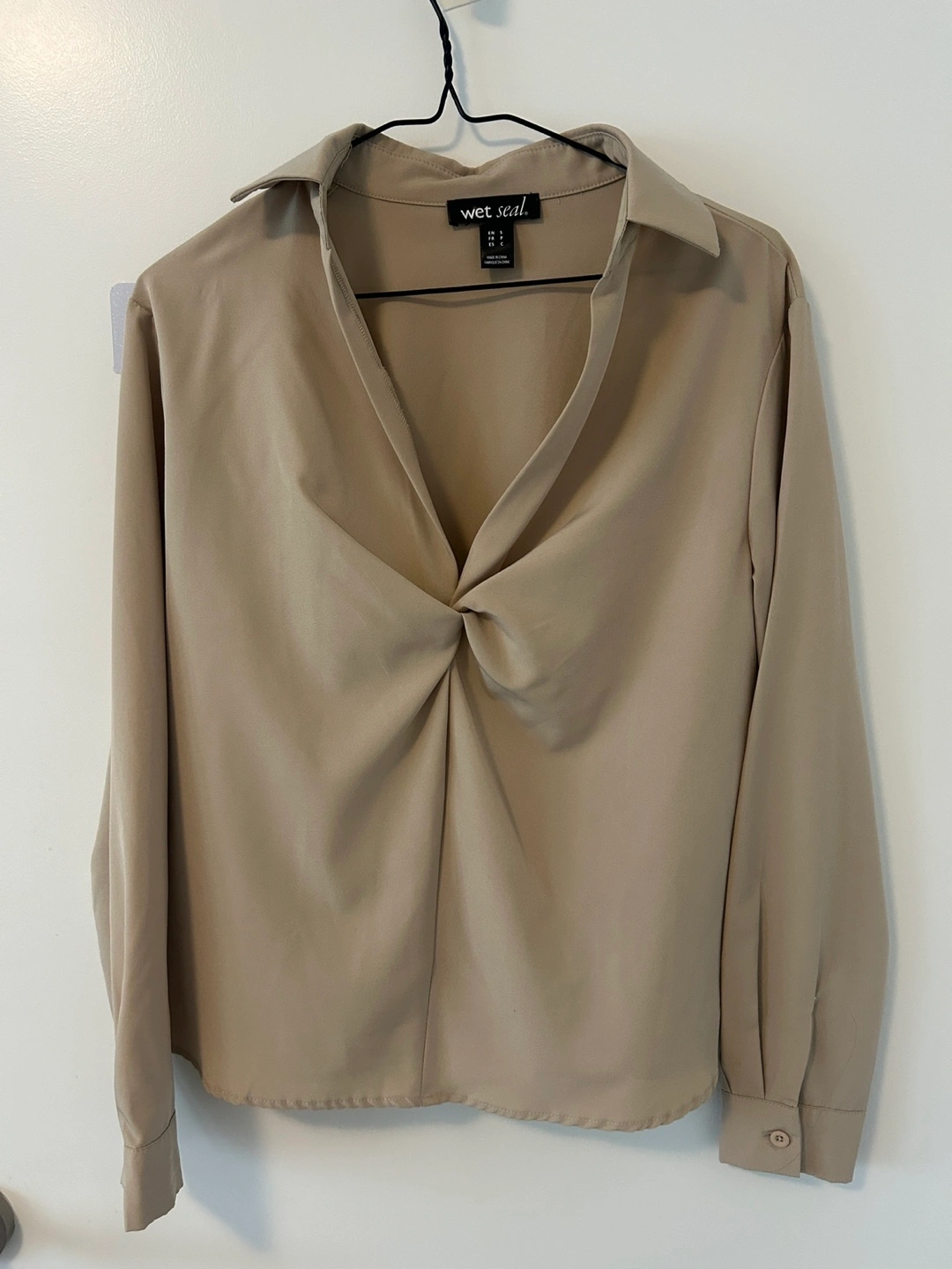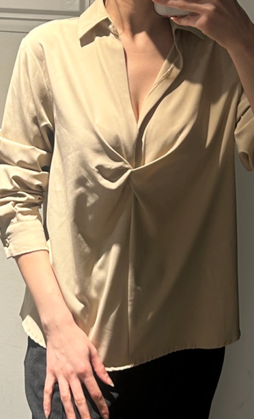Long sleeve blouse. Taupe colour. Collared neckline with a twist detail. Made in China.