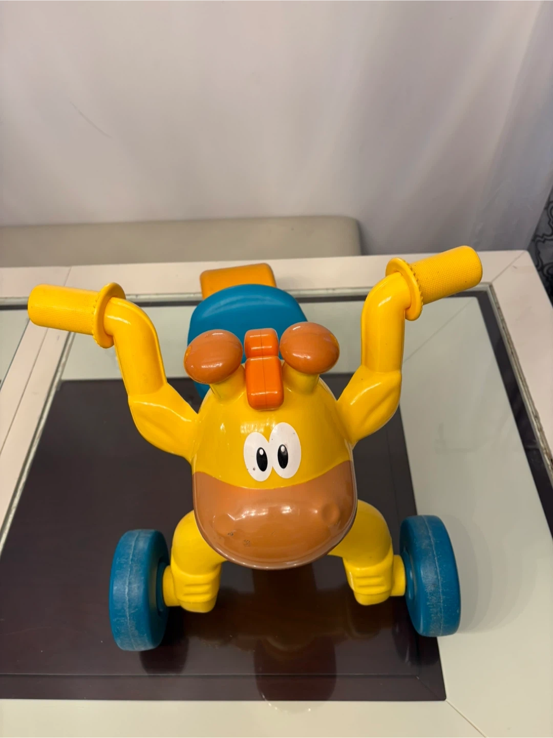 A fun and colourful wheeled giraffe toy! It's perfect for little ones who are learning to balance and move around. It has a cute design and sturdy construction, making it a great addition to any playroom. It is used so it does have a few scratches