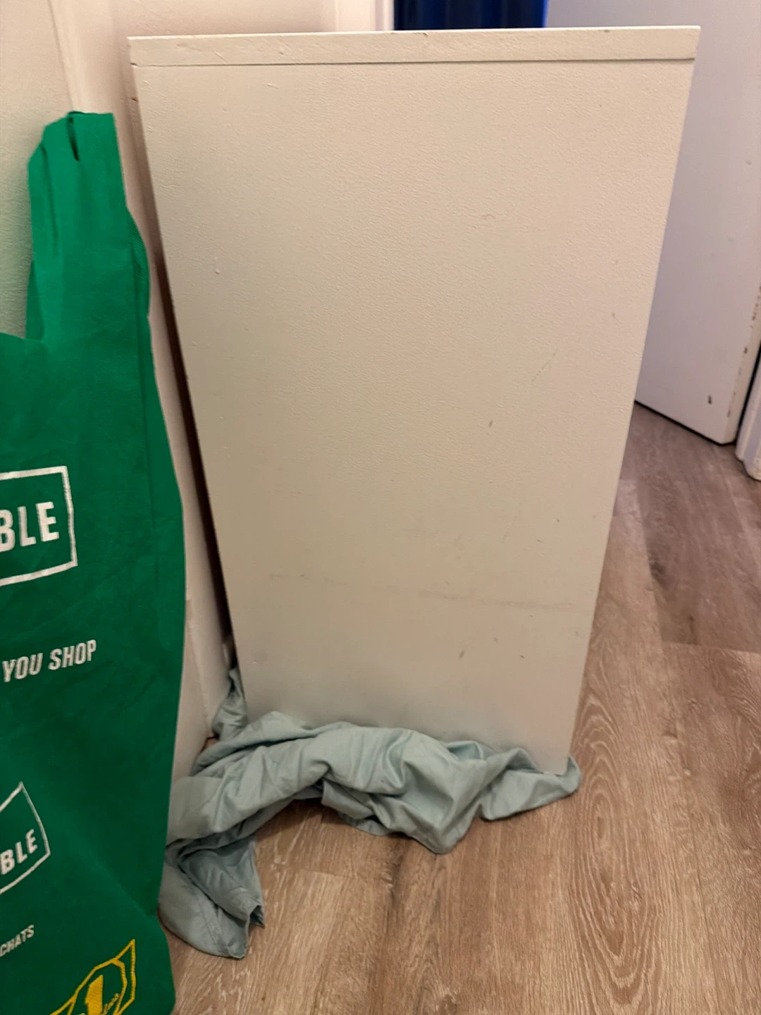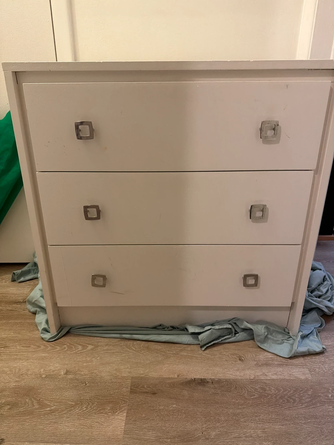 Here's a white three-drawer dresser, perfect for adding some storage to your space! It's a simple design that would fit well in any room. There are some signs of use, but it's still in good condition and ready to go to a new home