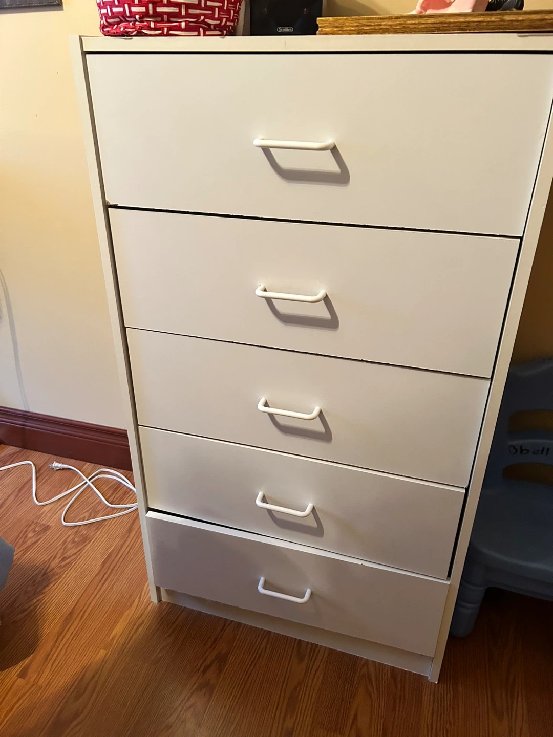 Selling a white dresser with 5 drawers. It's perfect for adding some extra storage to any room in your home