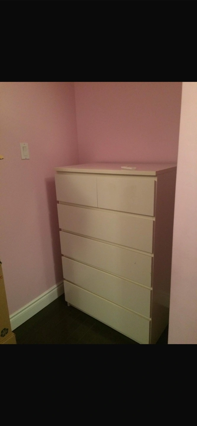 Selling a dresser with six drawers. It's white and in good condition. Perfect for adding extra storage to a bedroom or closet