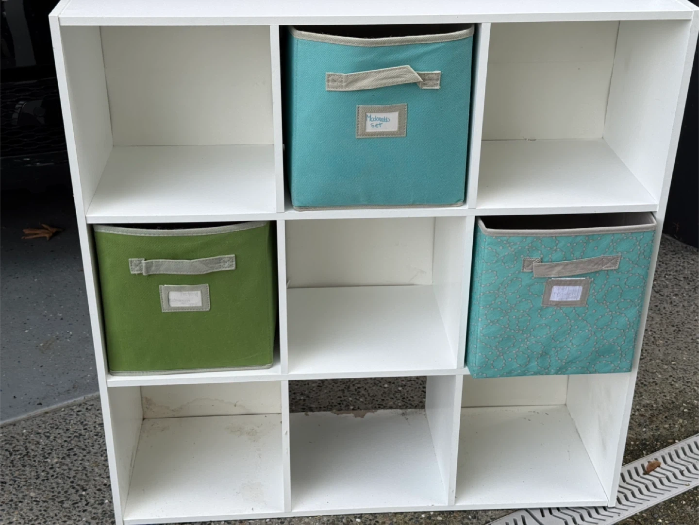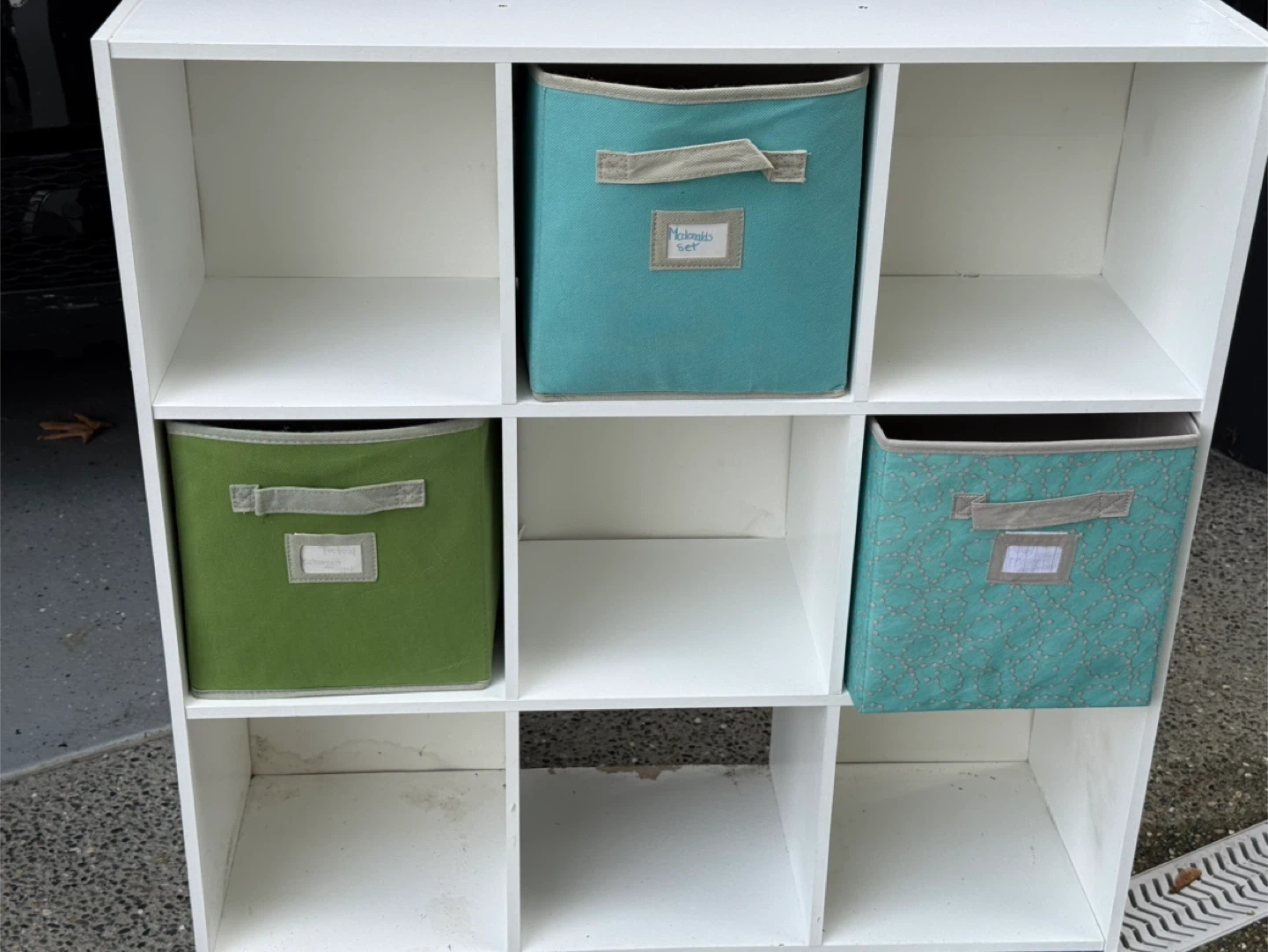 Selling a white 9-cube storage shelf! It comes with three fabric storage bins in teal and green. Great for organizing toys, books, or other items around the house